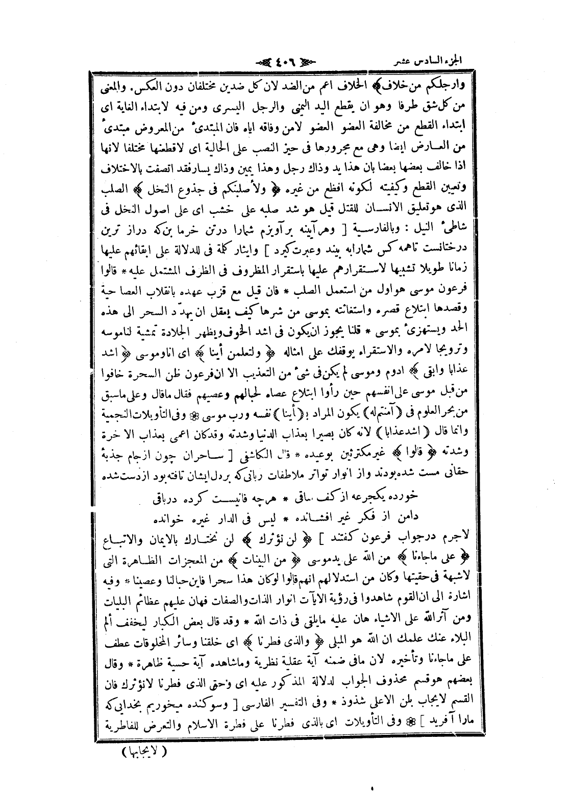 الخلاف أعم من الضد لان كل ضدين مختلفان دون العكس. والمعنى من كل شق طرفا وهو ان يقطع اليد اليمنى والرجل اليسرى ومن فيه لابتداء الغاية اى ابتداء القطع من مخالفة العضو العضو لامن وفاقه إياه فان المبتدئ من المعروض مبتدئ من العارض ايضا وهى مع مجرورها فى حيز النصب على الحالية اى لاقطعنها مختلفا لانها إذا خالف بعضها بعضا بان هذا يد وذاك رجل وهذا يمين وذاك يسار فقد اتصفت بالاختلاف وتعيين القطع وكيفيته لكونه أفظع من غيره وَلَأُصَلِّبَنَّكُمْ فِي جُذُوعِ النَّخْلِ الصلب الذي هو تعليق الإنسان للقتل قيل هو شد صلبه على خشب اى على اصول النخل فى شاطئ النيل: وبالفارسية [وهر آيينه بر آويزم شما را در تن خرما بن كه درازترين درختانست تا همه كس شما را به بيند وعبرت كيرد] وإيثار كلمة فى للدلالة على ابقائهم عليها زمانا طويلا تشبيها لاستقرارهم عليها باستقرار المظروف فى الظرف المشتمل عليه قالوا فرعون موسى هو أول من استعمل الصلب فان قيل مع قزب عهده بانقلاب العصا حية وقصدها ابتلاع قصره واستغاثته بموسى من شرها كيف يعقل ان يهدّد السحر الى هذه الحد ويستهزئ بموسى قلنا يجوز ان يكون فى أشد الخوف ويظهر الجلادة تمشية لناموسه وترويجا لامره والاستقراء يوقفك على أمثاله وَلَتَعْلَمُنَّ أَيُّنا اى انا وموسى أَشَدُّ عَذاباً وَأَبْقى أدوم وموسى لم يكن فى شىء من التعذيب الا ان فرعون ظن السحرة خافوا من قبل موسى على أنفسهم حين رأوا ابتلاع عصاه لحبالهم وعصيهم فقال ما قال وعلى ما سبق من بحر العلوم فى آمَنْتُمْ لَهُ يكون المراد ب أَيُّنا نفسه ورب موسى وفى التأويلات النجمية وانما قال أَشَدُّ عَذاباً لانه كان بصيرا بعذاب الدنيا وشدته وقد كان أعمى بعذاب الاخرة وشدته قالُوا غير مكترثين بوعيده قال الكاشفى [ساحران چون از جام جذبه حقانى مست شده بودند واز أنوار تواتر ملاطفات ربانى كه بر دل ايشان تافته بود از دست شده خورده يكجرعه از كف ساقى هر چهـ فانيست كرده در باقى دامن از فكر غير افشانده ليس فى الدار غيره خوانده لا جرم در جواب فرعون كفتند] لَنْ نُؤْثِرَكَ لن نختارك بالايمان والاتباع عَلى ما جاءَنا من الله على يد موسى مِنَ الْبَيِّناتِ من المعجزات الظاهرة التي لا شبهة فى حقيتها وكان من استدلالهم انهم قالوا لو كان هذا سحرا فاين حبالنا وعصينا وفيه اشارة الى ان القوم شاهدوا فى رؤية الآيات أنوار الذات والصفات فهان عليهم عظائم البليات ومن آثر الله على الأشياء هان عليه ما يلقى فى ذات الله وقد قال بعض الكبار ليخفف ألم البلاء عنك علمك ان الله هو المبلى وَالَّذِي فَطَرَنا اى خلقنا وسائر المخلوقات عطف على ما جاءنا وتأخيره لان ما فى ضمنه آية عقلية نظرية وما شاهده آية حسية ظاهرة وقال بعضهم هو قسم محذوف الجواب لدلالة المذكور عليه اى وحق الذي فطرنا لا نؤثرك فان القسم لا يجاب بلن الا على شذوذ وفى التفسير الفارسي [وسوكنده ميخوريم بخدايى كه ما را آفريد] وفى التأويلات اى بالذي فطرنا على فطرة الإسلام والتعرض للفاطرية