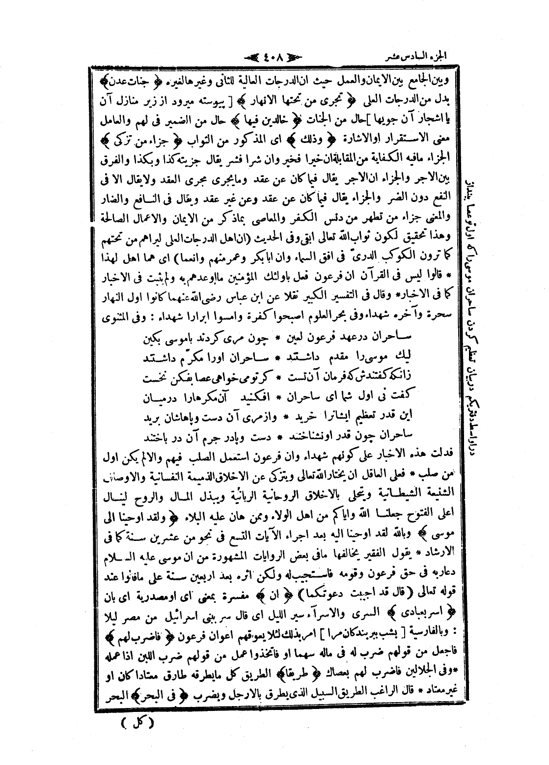 وبين الجامع بين الايمان والعمل حيث ان الدرجات العالية للثانى وغيرها لغيره جَنَّاتُ عَدْنٍ بدل من الدرجات العلى تَجْرِي مِنْ تَحْتِهَا الْأَنْهارُ [پيوسته ميرود از زير منازل آن يا أشجار آن جويها] حال من الجنات خالِدِينَ فِيها حال من الضمير فى لهم والعامل معنى الاستقرار او الاشارة وَذلِكَ اى المذكور من الثواب جَزاءُ مَنْ تَزَكَّى الجزاء ما فيه الكفاية من المقابلة ان خيرا فخير وان شرا فشر يقال جزيته كذا وبكذا والفرق بين الاجر والجزاء ان الاجر يقال فيما كان عن عقد وما يجرى مجرى العقد ولا يقال الا فى النفع دون الضر والجزاء يقال فيما كان عن عقد وعن غير عقد ويقال فى النافع والضار والمعنى جزاء من تطهر من دنس الكفر والمعاصي بما ذكر من الايمان والأعمال الصالحة وهذا تحقيق لكون ثواب الله تعالى أبقى وفى الحديث (ان اهل الدرجات العلى ليراهم من تحتهم كما ترون الكوكب الدرىّ فى أفق السماء وان أبا بكر وعمر منهم وأنعما) اى هما اهل لهذا قالوا ليس فى القرآن ان فرعون فعل باولئك المؤمنين ما أوعدهم به ولم يثبت فى الاخبار كما فى الاخبار وقال فى التفسير الكبير نقلا عن ابن عباس رضى الله عنهما كانوا أول النهار سحرة وآخره شهداء وفى بحر العلوم أصبحوا كفرة وامسوا أبرارا شهداء: وفى المثنوى