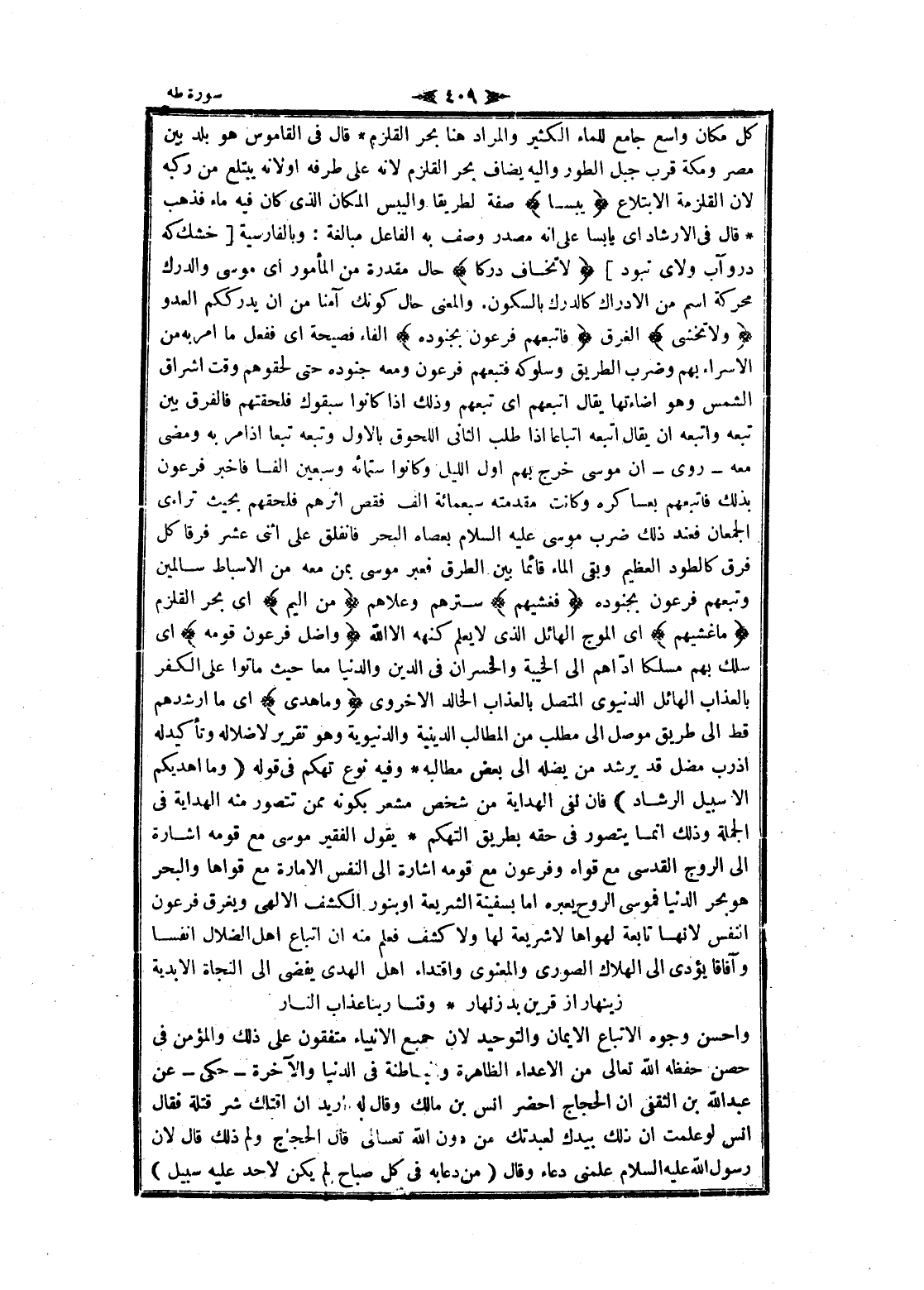 كل مكان واسع جامع للماء الكثير والمراد هنا بحر القلزم قال فى القاموس هو بلد بين مصر ومكة قرب جبل الطور واليه يضاف بحر القلزم لانه على طرفه او لانه يبتلع من ركبه لان القلزمة الابتلاع يَبَساً صفة لطريقا واليبس المكان الذي كان فيه ماء فذهب قال فى الإرشاد اى يابسا على انه مصدر وصف به الفاعل مبالغة: وبالفارسية [خشك كه درو آب ولاى نبود] لا تَخافُ دَرَكاً حال مقدرة من المأمور اى موسى والدرك محركة اسم من الإدراك كالدرك بالسكون. والمعنى حال كونك آمنا من ان يدرككم العدو وَلا تَخْشى الغرق فَأَتْبَعَهُمْ فِرْعَوْنُ بِجُنُودِهِ الفاء فصيحة اى ففعل ما امر به من الاسراء بهم وضرب الطريق وسلوكه فتبعهم فرعون ومعه جنوده حتى لحقوهم وقت اشراق الشمس وهو اضاءتها يقال اتبعهم اى تبعهم وذلك إذا كانوا سبقوك فلحقتهم فالفرق بين تبعه واتبعه ان يقال اتبعه اتباعا إذا طلب الثاني اللحوق بالأول وتبعه تبعا إذا مر به ومضى معه- روى- ان موسى خرج بهم أول الليل وكانوا ستمائه وسبعين الفا فاخبر فرعون بذلك فاتبعهم بعساكره وكانت مقدمته سبعمائة الف فقص اثرهم فلحقهم بحيث تراءى الجمعان فعند ذلك ضرب موسى عليه السلام بعصاه البحر فانفلق على اثنى عشر فرقا كل فرق كالطود العظيم وبقي الماء قائما بين الطرق فعبر موسى بمن معه من الأسباط سالمين وتبعهم فرعون بجنوده فَغَشِيَهُمْ سترهم وعلاهم مِنَ الْيَمِّ اى بحر القلزم ما غَشِيَهُمْ اى الموج الهائل الذي لا يعلم كنهه الا الله وَأَضَلَّ فِرْعَوْنُ قَوْمَهُ اى سلك بهم مسلكا ادّاهم الى الخيبة والخسران فى الدين والدنيا معا حيث ماتوا على الكفر بالعذاب الهائل الدنيوي المتصل بالعذاب الخالد الأخروي وَما هَدى اى ما ارشدهم قط الى طريق موصل الى مطلب من المطالب الدينية والدنيوية وهو تقرير لاضلاله وتأكيد له إذ رب مضل قد يرشد من يضله الى بعض مطالبه وفيه نوع تهكم فى قوله وَما أَهْدِيكُمْ إِلَّا سَبِيلَ الرَّشادِ فان نفى الهداية من شخص مشعر بكونه ممن تتصور منه الهداية فى الجملة وذلك انما يتصور فى حقه بطريق التهكم يقول الفقير موسى مع قومه اشارة الى الروح القدسي مع قواه وفرعون مع قومه اشارة الى النفس الامارة مع قواها والبحر هو بحر الدنيا فموسى الروح يعبره اما بسفينة الشريعة او بنور الكشف الإلهي ويغرق فرعون النفس لانها تابعة لهواها لا شريعة لها ولا كشف فعلم منه ان اتباع اهل الضلال أنفسا وآفاقا يؤدى الى الهلاك الصوري والمعنوي واقتداء اهل الهدى يفضى الى النجاة الابدية