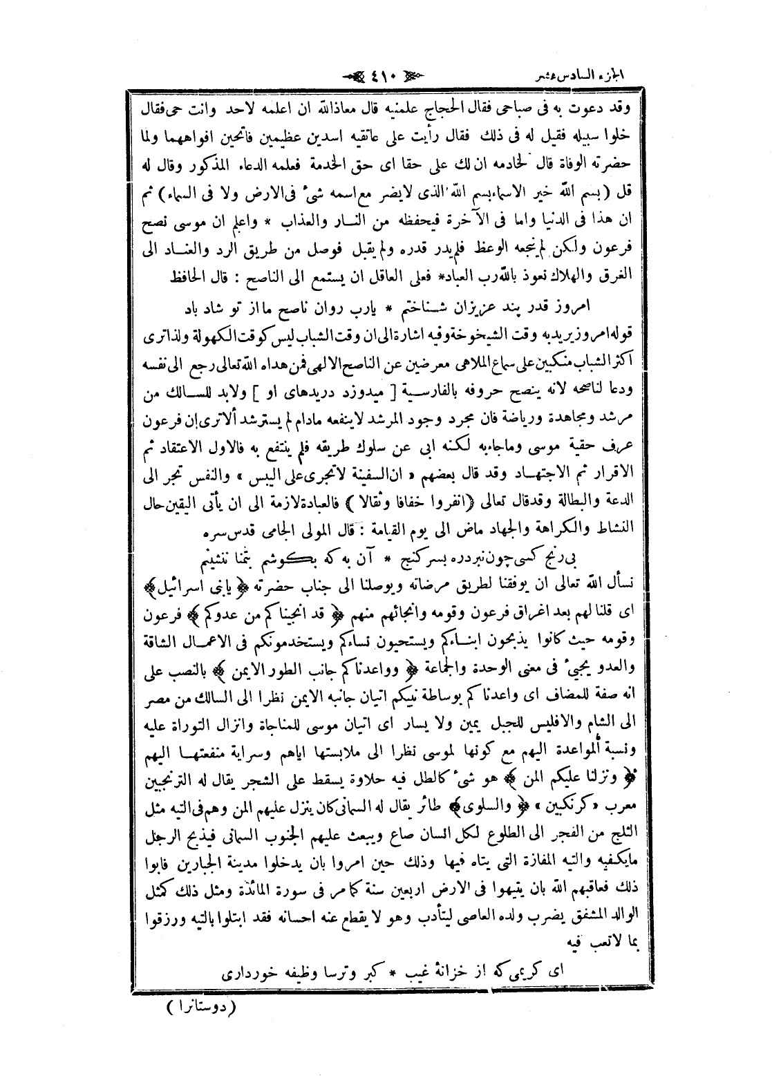 وقد دعوت به فى صباحى فقال الحجاج علمنيه قال معاذ الله ان اعلمه لاحد وأنت حى فقال خلوا سبيله فقيل له فى ذلك فقال رأيت على عاتقيه أسدين عظيمين فاتحين افواههما ولما حضرته الوفاة قال لخادمه ان لك على حقا اى حق الخدمة فعلمه الدعاء المذكور وقال له قل (بسم الله خير الأسماء بسم الله الذي لا يضر مع اسمه شىء فى الأرض ولا فى السماء) ثم ان هذا فى الدنيا واما فى الآخرة فيحفظه من النار والعذاب واعلم ان موسى نصح فرعون ولكن لم ينجعه الوعظ فلم يدر قدره ولم يقبل فوصل من طريق الرد والعناد الى الغرق والهلاك نعوذ بالله رب العباد فعلى العاقل ان يستمع الى الناصح: قال الحافظ