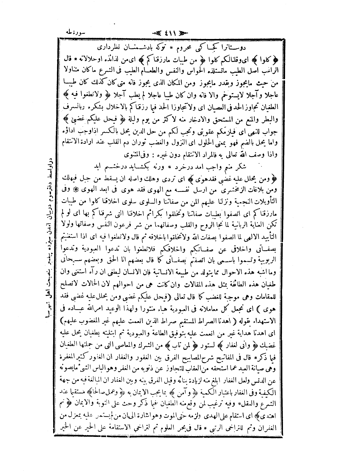 كُلُوا اى وقلنا لكم كلوا مِنْ طَيِّباتِ ما رَزَقْناكُمْ اى من لذائذه او حلالاته قال الراغب اصل الطيب ما تستلذه الحواس والنفس والطعام الطيب فى الشرع ما كان متناولا من حيث ما يجوز وبقدر ما يجوز ومن المكان الذي يجوز فانه متى كان كذلك كان طيبا عاجلا وآجلا لا يستوخم والا فانه وان كان طيبا عاجلا لم يطب آجلا وَلا تَطْغَوْا فِيهِ الطغيان تجاوز الحد فى العصيان اى ولا تتجاوزا الحد فيما رزقناكم بالإخلال بشكره وبالسرف والبطر والمنع من المستحق والادخار منه لا كثر من يوم وليلة فَيَحِلَّ عَلَيْكُمْ غَضَبِي جواب للنهى اى فيلزمكم عقوبتى وتجب لكم من حل الدين يحل بالكسر إذا وجب أداؤه واما يحل بالضم فهو بمعنى الحلول اى النزول والغضب ثوران دم القلب عند ارادة الانتقام وإذا وصف الله تعالى به فالمراد الانتقام دون غيره: وفى المثنوى