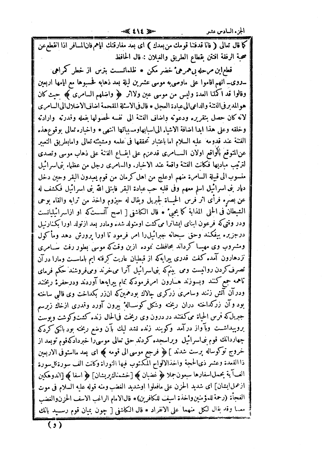 - روى- انهم أقاموا على ما وصى به موسى عشرين ليلة بعد ذهابه فحسبوها مع أيامها أربعين وقالوا قد اكملنا العدة وليس من موسى عين ولا اثر وَأَضَلَّهُمُ السَّامِرِيُّ حيث كان هو المدبر فى الفتنة والداعي الى عبادة العجل قال فى الاسئلة المقحمة أضاف الإضلال الى السامري لانه كان حصل بتقريره ودعوته وأضاف الفتنة الى نفسه لحصولها بفعله وقدرته وإرادته وخلقه وعلى هذا ابدا اضافة الأشياء الى أسبابها ومسبباتها انتهى واخباره تعالى بوقوع هذه الفتنة عند قدومه عليه السلام اما باعتبار تحققها فى علمه ومشيئته تعالى واما بطريق التعبير عن المتوقع بالواقع او لان السامري قد عزم على إيقاع الفتنة على ذهاب موسى وتصدى لترتيب مباديها فكانت الفتنة واقعة عند الاخبار. والسامري رجل من عظماء بنى إسرائيل منسوب الى قبيلة السامرة منهم او علج من اهل كرمان من قوم يعبدون البقر وحين دخل ديار بنى إسرائيل اسلم معهم وفى قلبه حب عبادة البقر فابتلى الله بنى إسرائيل فكشف له عن بصره فرأى اثر فرس الحياة لجبريل ويقال له حيزوم وأخذ من ترابه وألقاه بوحي الشيطان فى الحلي المذابة كما يجيئ قال الكاشفى [أصح آنست كه او از اسرائيليانست ودر وقتى كه فرعون ابناى ايشانرا مى كشت او متولد شده ومادر بعد از تولد او را بكنار نيل در جزيره بيفكند وحق سبحانه جبرائيل را امر فرمود تا او را پرورش دهد ومأكول ومشروب وى مهيا كرداند محافظت نموده ازين وقت كه موسى بطور رفت سامرى نزد هارون آمده كفت قدرى پيرايه كه از قبطيان عاريت كرفته ايم با ماست وما را در آن تصرف كردن روا نيست ومى بينم كه بنى إسرائيل آنرا مى خرند ومى فروشند حكم فرماى تا همه جمع كنند وبسوزند هارون امر فرمود كه تمام پيرايه ها آوردند ودر حفره ريختند ودر آن آتش زنند وسامرى زركرى چالاك بود همين كه ان زر بگداخت وى قالبى ساخته بود وآن زر كداخته در ان ريخته وشكل كوساله بيرون آورد وقدرى از خاك زير سم جبريل كه فرس الحياة مى كفتند در درون وى ريخت فى الحال زنده كشت وكوشت و پوست برو پيداشت وبآواز در آمد وكويند زنده نشد ليك بآن وضع ريخته بود بانكى كرد كه چهار دانك قوم بنى إسرائيل ويرا سجده كردند حق تعالى موسى را خبر داد كه قوم تو بعد از خروج تو كوساله پرست شدند] فَرَجَعَ مُوسى إِلى قَوْمِهِ اى بعد ما استوفى الأربعين ذا القعدة وعشر ذى الحجة وأخذ الألواح المكتوب فيها التوراة وكانت الف سورة كل سورة الف آية يحمل اسفارها سبعون جملا غَضْبانَ [خشمناك پريشان] أَسِفاً [اندوهگين از عمل ايشان] اى شديد الحزن على ما فعلوا او شديد الغضب ومنه قوله عليه السلام فى موت الفجأة (رحمة للمؤمنين واخذة أسيف للكافرين) قال الامام الراغب الأسف الحزن والغضب معا وقد يقال لكل منهما على الانفراد قال الكاشفى [چون بميان قوم رسيد بانك