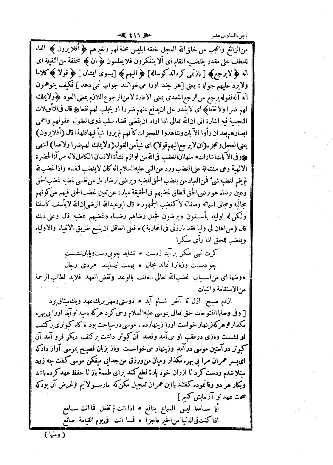 من الزائغ واعجب من خلق الله العجل خلقه إبليس محنة لهم ولغيرهم أَفَلا يَرَوْنَ الفاء للعطف على مقدر يقتضيه المقام اى ألا يتفكرون فلا يعلمون ان مخففة من الثقيلة اى انه أَلَّا يَرْجِعُ [باز نمى كرداند كوساله] إِلَيْهِمْ [بسوى ايشان] قَوْلًا كلاما ولا يرد عليهم جوابا: يعنى [هر چند او را مى خوانند جواب نمى دهد] فكيف يتوهمون انه آله فقوله يرجع من الرجع المتعدى بمعنى الاعادة لا من الرجوع اللازم بمعنى العود وَلا يَمْلِكُ لَهُمْ ضَرًّا وَلا نَفْعاً اى لا يقدر على ان يدفع عنهم ضررا او يجلب لهم نفعا قال فى التأويلات النجمية فيه اشارة الى ان الله تعالى إذا أراد ان يقضى قضاء سلب ذوى العقول عقولهم وأعمى أبصارهم بعد ان رأوا الآيات وشاهدوا المعجزات كأنهم لم يروا شيأ فيها فلهذا قال أَفَلا يَرَوْنَ يعنى العجل وعجزه أَلَّا يَرْجِعُ إِلَيْهِمْ قَوْلًا اى شيأ من القول وَلا يَمْلِكُ لَهُمْ ضَرًّا وَلا نَفْعاً انتهى وفى الآيات إشارات منها ان الغضب فى الله من لوازم نشأة الإنسان الكامل لانه مرآة الحضرة الالهية وهى مشتملة على الغضب ورد عن النبي عليه السلام انه كان لا يغضب لنفسه وإذا غضب لله لم يقم لغضبه شىء فمن العباد من يغضب الحق لغضبه ويرضى لرضاه بل من نفسى غضبه غضب الحق وعين رضاه هو رضى الحق فمطلق غضبهم فى الحقيقة عبارة عن تعين غضب الحق فيهم من كونهم مجاليه ومجالى أسمائه وصفاته لا كغضب الجمهور قال ابو عبد الله الرضى ان الله لا يأسف كاسفنا ولكن له اولياء يأسفون ويرضون فجعل رضاهم رضاه وغضبهم غضبه قال وعلى ذلك قال (من أهان لى وليا فقد بارزني فى المحاربة) فعلى العاقل ان يتبع طريق الأنبياء والأولياء ويغضب للحق إذا رأى منكرا