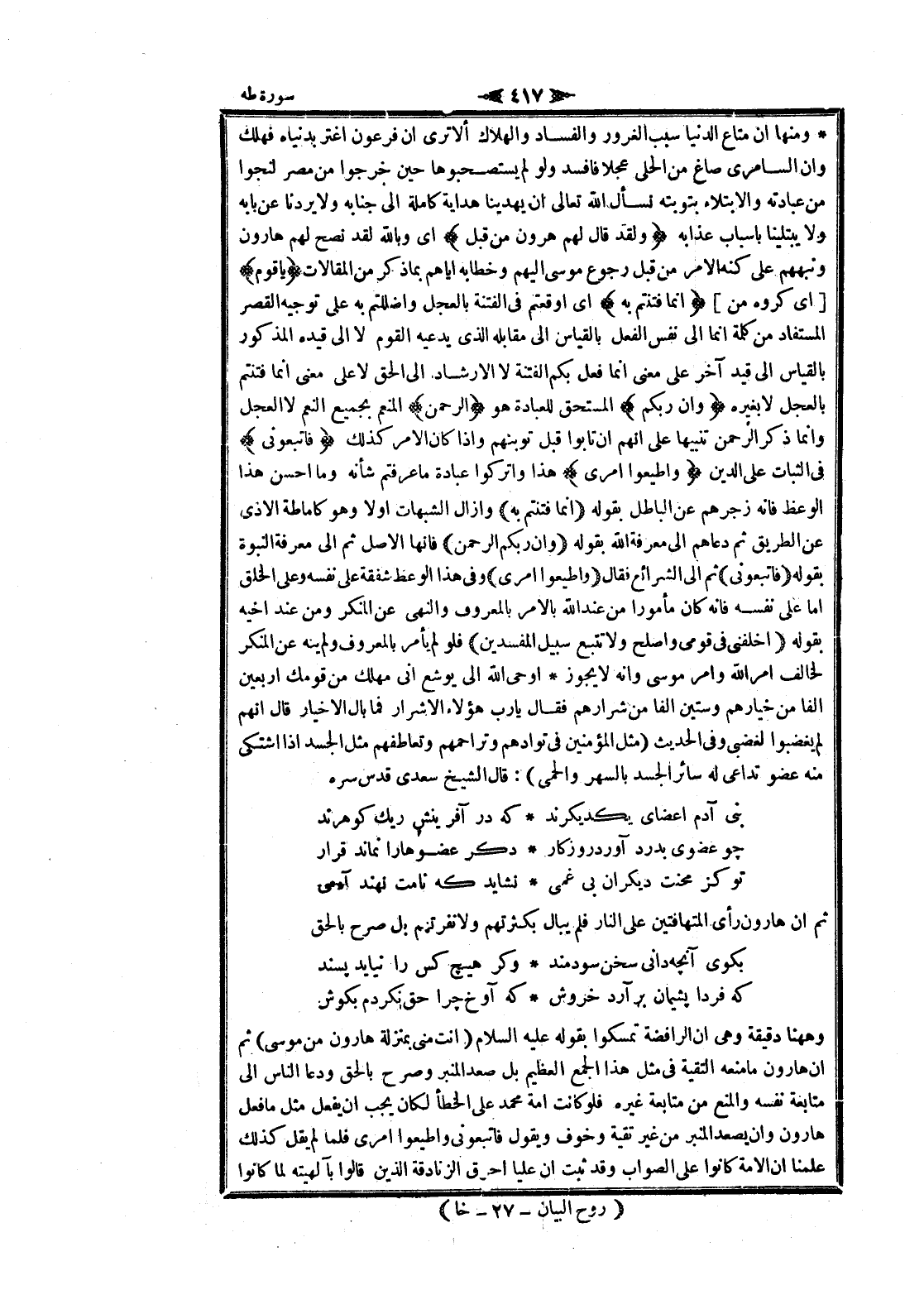 ومنها ان متاع الدنيا سبب الغرور والفساد والهلاك ألا ترى ان فرعون اغتر بدنياه فهلك وان السامري صاغ من الحلي عجلا فافسد ولو لم يستصحبوها حين خرجوا من مصر لنجوا من عبادته والابتلاء بتوبته نسأل الله تعالى ان يهدينا هداية كاملة الى جنابه ولا يردنا عن بابه ولا يبتلينا بأسباب عذابه وَلَقَدْ قالَ لَهُمْ هارُونُ مِنْ قَبْلُ اى وبالله لقد نصح لهم هارون ونبههم على كنه الأمر من قبل رجوع موسى إليهم وخطابه إياهم بما ذكر من المقالات يا قَوْمِ [اى كروه من] إِنَّما فُتِنْتُمْ بِهِ اى اوقعتم فى الفتنة بالعجل وأضللتم به على توجيه القصر المستفاد من كلمة انما الى نفس الفعل بالقياس الى مقابله الذي يدعيه القوم لا الى قيده المذكور بالقياس الى قيد آخر على معنى انما فعل بكم الفتنة لا الإرشاد الى الحق لا على معنى انما فتنتم بالعجل لا بغيره وَإِنَّ رَبَّكُمُ المستحق للعبادة هو الرَّحْمنُ المنعم بجميع النعم لا العجل وانما ذكر الرحمن تنبيها على انهم ان تابوا قبل توبنهم وإذا كان الأمر كذلك فَاتَّبِعُونِي فى الثبات على الدين وَأَطِيعُوا أَمْرِي هذا واتركوا عبادة ما عرفتم شأنه وما احسن هذا الوعظ فانه زجرهم عن الباطل بقوله إِنَّما فُتِنْتُمْ بِهِ وأزال الشبهات اولا وهو كاماطة الأذى عن الطريق ثم دعاهم الى معرفة الله بقوله وَإِنَّ رَبَّكُمُ الرَّحْمنُ فانها الأصل ثم الى معرفة النبوة بقوله فَاتَّبِعُونِي) ثم الى الشرائع فقال وَأَطِيعُوا أَمْرِي وفى هذا الوعظ شفقة على نفسه وعلى الخلق اما على نفسه فانه كان مأمورا من عند الله بالأمر بالمعروف والنهى عن المنكر ومن عند أخيه بقوله اخْلُفْنِي فِي قَوْمِي وَأَصْلِحْ وَلا تَتَّبِعْ سَبِيلَ الْمُفْسِدِينَ فلو لم يأمر بالمعروف ولم ينه عن المنكر لخالف امر الله وامر موسى وانه لا يجوز اوحى الله الى يوشع انى مهلك من قومك أربعين الفا من خيارهم وستين الفا من شرارهم فقال يا رب هؤلاء الأشرار فما بال الأخيار قال انهم لم يغضبوا لغضبى وفى الحديث (مثل المؤمنين فى توادهم وتراحمهم وتعاطفهم مثل الجسد إذا اشتكى منه عضو تداعى له سائر الجسد بالسهر والحمى) : قال الشيخ سعدى قدس سره