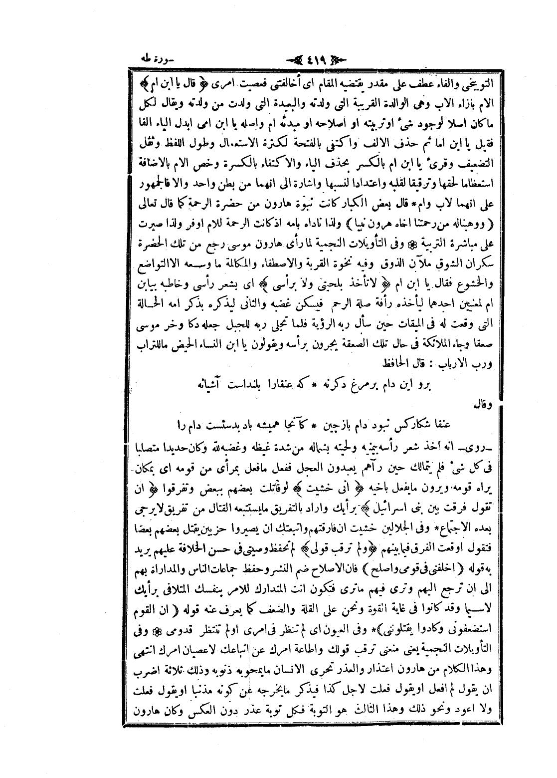 - روى- انه أخذ شعر رأسه بيمينه ولحيته بشماله من شدة غيظه وغضبه لله وكان حديدا متصلبا فى كل شىء فلم يتمالك حين رآهم يعبدون العجل ففعل ما فعل بمرأى من قومه اى بمكان يراه قومه ويرون ما يفعل بأخيه نِّي خَشِيتُ