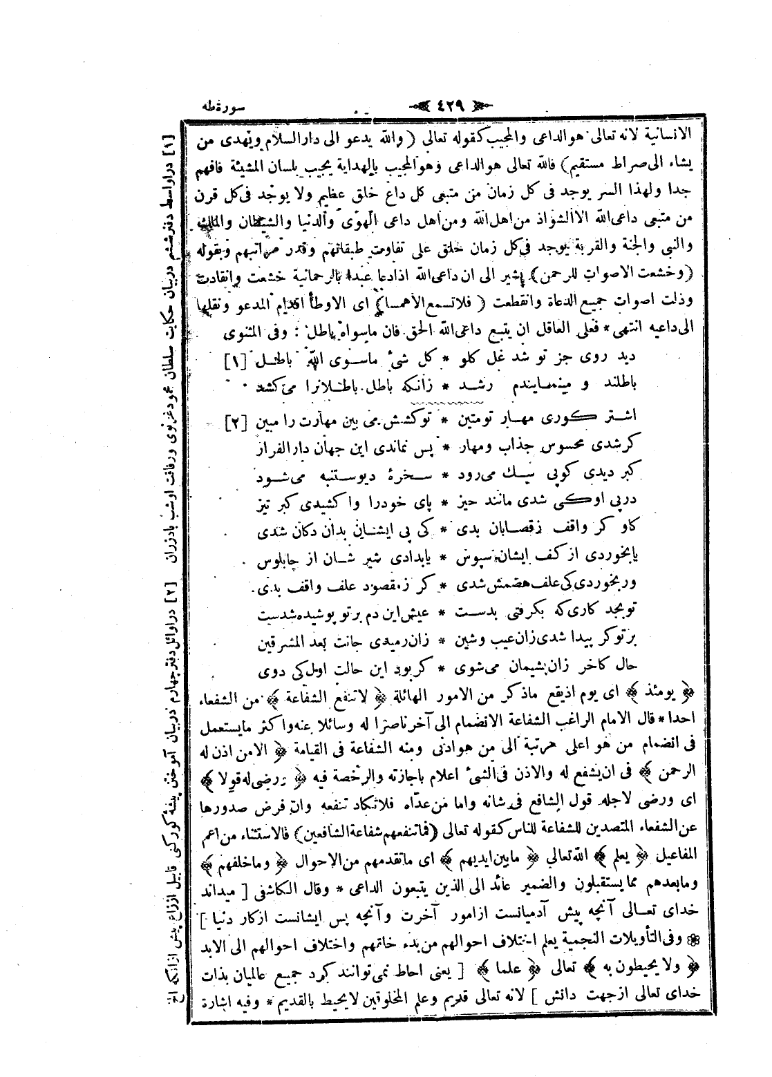الانسانية لانه تعالى هو الداعي والمجيب كقوله تعالى وَاللَّهُ يَدْعُوا إِلى دارِ السَّلامِ وَيَهْدِي مَنْ يَشاءُ إِلى صِراطٍ مُسْتَقِيمٍ فالله تعالى هو الداعي وهو المجيب بالهداية يجيب بلسان المشيئة فافهم جدا ولهذا السر يوجد فى كل زمان من متبعى كل داع خلق عظيم ولا يوجد فى كل قرن من متبعى داعى الله الا الشواذ من اهل الله ومن اهل داعى الهوى والدنيا والشيطان والملك والنبي والجنة والقربة يوجد فى كل زمان خلق على تفاوت طبقاتهم وقدر مراتبهم وبقوله وَخَشَعَتِ الْأَصْواتُ لِلرَّحْمنِ يشير الى ان داعى الله إذا دعا عبدا بالرحمانية خشعت وانقادت وذلت أصوات جميع الدعاة وانقطعت فَلا تَسْمَعُ إِلَّا هَمْساً اى إلا وطأ أقدام المدعو ونقلها الى داعيه انتهى فعلى العاقل ان يتبع داعى الله الحق فان ما سواه باطل: وفى المثنوى