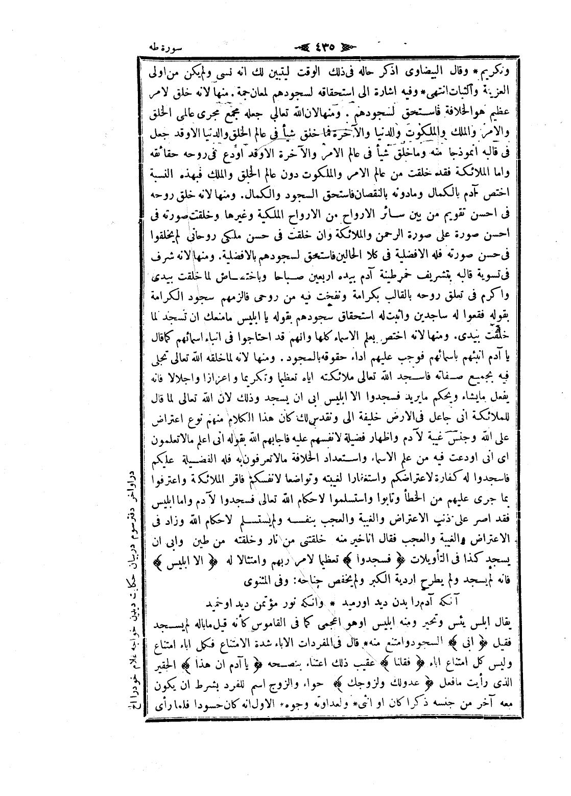 وتكريم وقال البيضاوي اذكر حاله فى ذلك الوقت ليتبين لك انه نسى ولم يكن من اولى العزيمة والثبات انتهى وفيه اشارة الى استحقاقه لسجودهم لمعان جمة. منها لانه خلق لامر عظيم هو الخلافة فاستحق لسجودهم. ومنها لان الله تعالى جعله مجمع مجرى عالمى الخلق والأمر والملك والملكوت والدنيا والآخرة فما خلق شيأ فى عالم الخلق والدنيا الا وقد جعل فى قالبه أنموذجا منه وما خلق شيأ فى عالم الأمر والآخرة الا وقد أودع فى روحه حقائقه واما الملائكة فقد خلقت من عالم الأمر والملكوت دون عالم الخلق والملك فبهذه النسبة اختص آدم بالكمال وما دونه بالنقصان فاستحق السجود والكمال. ومنها لانه خلق روحه فى احسن تقويم من بين سائر الأرواح من الأرواح الملكية وغيرها وخلقت صورته فى احسن صورة على صورة الرحمن والملائكة وان خلقت فى حسن ملكى روحانى لم يخلقوا فى حسن صورته فله الافضلية فى كلا الحالين فاستحق لسجودهم بالافضلية. ومنها لانه شرف فى تسوية قالبه بتشريف خمر طينة آدم بيده أربعين صباحا وباختصاص لما خلقت بيدي وأكرم فى تعلق روحه بالقالب بكرامة ونفخت فيه من روحى فالزمهم سجود الكرامة بقوله فقعوا له ساجدين واثبت له استحقاق سجودهم بقوله يا إبليس ما منعك ان تسجد لما خلقت بيدي. ومنها لانه اختص بعلم الأسماء كلها وانهم قد احتاجوا فى انباء اسمائهم كما قال يا آدم انبئهم بأسمائهم فوجب عليهم أداء حقوقه بالسجود. ومنها لانه لما خلقه الله تعالى تجلى فيه بجميع صفاته فاسجد الله تعالى ملائكته إياه تعظيما وتكريما وإعزازا وإجلالا فانه يفعل ما يشاء ويحكم ما يريد فسجدوا الا إبليس ابى ان يسجد وذلك لان الله تعالى لما قال للملائكة انى جاعل فى الأرض خليفة الى ونقدس لك كان هذا الكلام منهم نوع اعتراض على الله وجنس غيبة لآدم واظهار فضيلة لانفسهم عليه فاجابهم الله بقوله انى اعلم ما لا تعلمون اى انى أودعت فيه من علم الأسماء واستعداد الخلافة ما لا تعرفون به فله الفضيلة عليكم فاسجدوا له كفارة لاعتراضكم واستغفارا لغيبته وتواضعا لانفسكم فاقر الملائكة واعترفوا بما جرى عليهم من الخطأ وتابوا واستسلموا لاحكام الله تعالى فسجدوا لآدم واما إبليس فقد أصر على ذنب الاعتراض والغيبة والعجب بنفسه ولم يستسلم لاحكام الله وزاد فى الاعتراض والغيبة والعجب فقال انا خير منه خلقتنى من نار وخلقته من طين وابى ان يسجد كذا فى التأويلات فَسَجَدُوا تعظيما لامر ربهم وامتثالا له إِلَّا إِبْلِيسَ فانه لم يسجد ولم يطرح اردية الكبر ولم يخفص جناحه: وفى المثنوى