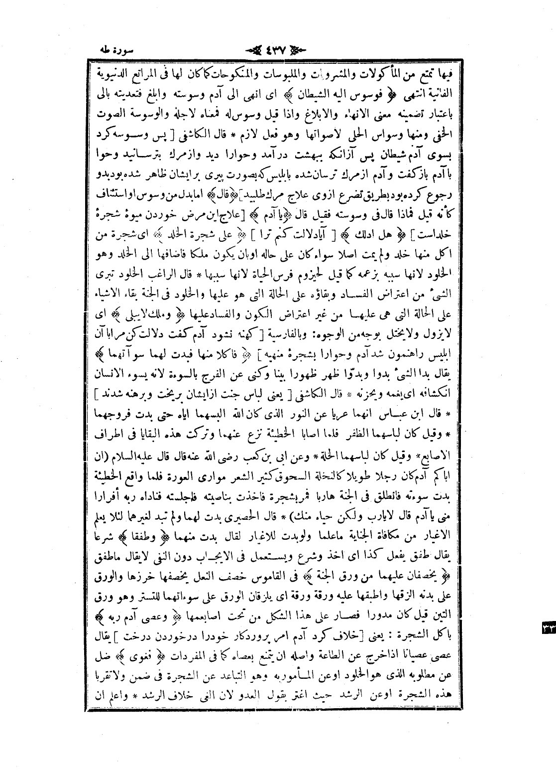 فيها تمتع من المأكولات والمشروبات والملبوسات والمنكوحات كما كان لها فى المراتع الدنيوية الفانية انتهى فَوَسْوَسَ إِلَيْهِ الشَّيْطانُ اى انهى الى آدم وسوسته وابلغ فتعديته بالى باعتبار تضمينه معنى الإنهاء والإبلاغ وإذا قيل وسوس له فمعناه لاجله والوسوسة الصوت الخفي ومنها وسواس الحلي لاصواتها وهو فعل لازم قال الكاشفى [پس وسوسه كرد بسوى آدم شيطان پس آز انكه ببهشت در آمد وحوارا ديد واز مرك بترسانيد وحوا با آدم باز كفت وآدم از مرك ترسان شده بإبليس كه بصورت پيرى بر ايشان ظاهر شده بود بدو رجوع كرده بود بطريق تضرع از وى علاج مرك طلبيد] قالَ اما بدل من وسوس او استئناف كأنه قيل فماذا قال فى وسوسته فقيل قال يا آدَمُ [علاج اين مرض خوردن ميوه شجره خلد است] هَلْ أَدُلُّكَ [آيا دلالت كنم ترا] عَلى شَجَرَةِ الْخُلْدِ اى شجرة من أكل منها خلد ولم يمت أصلا سواء كان على حاله او بان يكون ملكا فاضافها الى الخلد وهو الخلود لانها سببه بزعمه كما قيل لحيزوم فرس الحياة لانها سببها قال الراغب الخلود تبرى الشيء من اعتراض الفساد وبقاؤه على الحالة التي هو عليها والخلود فى الجنة بقاء الأشياء على الحالة التي هى عليها من غير اعتراض الكون والفساد عليها وَمُلْكٍ لا يَبْلى اى لا يزول ولا يختل بوجه من الوجوه: وبالفارسية [كهنه نشود آدم كفت دلالت كن مرا با آن إبليس راهنمون شد آدم وحوارا بشجره منهيه] فَأَكَلا مِنْها فَبَدَتْ لَهُما سَوْآتُهُما يقال بدا الشيء بدوا وبدوّا ظهر ظهورا بينا وكنى عن الفرج بالسوءة لانه يسوء الإنسان انكشافه اى يغمه ويحزنه قال الكاشفى [يعنى لباس جنت از ايشان بريخت وبرهنه شدند] قال ابن عباس انهما عريا عن النور الذي كان الله البسهما إياه حتى بدت فروجهما وقيل كان لباسهما الظفر فلما أصابا الخطيئة نزع عنهما وتركت هذه البقايا فى أطراف الأصابع وقيل كان لباسهما الخلة وعن ابى بن كعب رضى الله عنه قال قال عليه السلام (ان أباكم آدم كان رجلا طويلا كالنخلة السحوق كثير الشعر موارى العورة فلما واقع الخطيئة بدت سوءته فانطلق فى الجنة هاربا فمر بشجرة فاخذت بناصيته فاجلسته فناداه ربه أفرارا منى يا آدم قال لا يا رب ولكن حياء منك) قال الحصيري بدت لهما ولم تبد لغيرهما لئلا يعلم الأغيار من مكافاة الجناية ما علما ولو بدت للاغيار لقال بدت منهما وَطَفِقا شرعا يقال طفق يفعل كذا اى أخذ وشرع ويستعمل فى الإيجاب دون النفي لا يقال ما طفق يَخْصِفانِ عَلَيْهِما مِنْ وَرَقِ الْجَنَّةِ فى القاموس خصف النعل يخصفها خرزها والورق على بدنه ألزقها واطبقها عليه ورقة ورقة اى يلزقان الورق على سوءاتهما للتستر وهو ورق التين قيل كان مدورا فصار على هذا الشكل من تحت اصابعمها وَعَصى آدَمُ رَبَّهُ بأكل الشجرة: يعنى [خلاف كرد آدم امر پروردگار خود را در خوردن درخت] يقال عصى عصيانا إذا خرج عن الطاعة وأصله ان يتمنع بعصاه كما فى المفردات فَغَوى ضل عن مطلوبه الذي هو الخلود او عن المأمور به وهو التباعد عن الشجرة فى ضمن ولا تقربا هذه الشجرة او عن الرشد حيث اغتر بقول العدو لان الغى خلاف الرشد واعلم ان