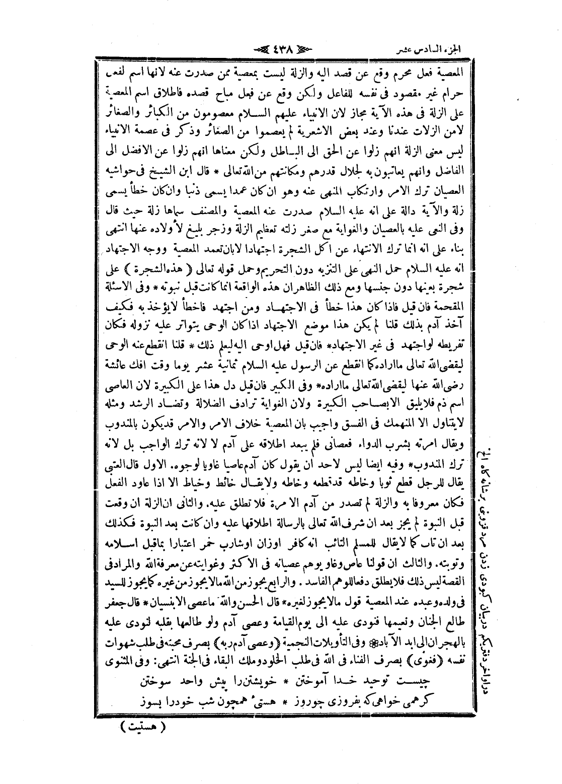 دون التحريم وحمل قوله تعالى هذِهِ الشَّجَرَةَ على شجرة بعينها دون جنسها ومع ذلك الظاهر ان هذه الواقعة انما كانت قبل نبوته وفى الاسئلة المقحمة فان قيل فاذا كان هذا خطأ فى الاجتهاد ومن اجتهد فاخطأ لا يؤخذ به فكيف آخذ آدم بذلك قلنا لم يكن هذا موضع الاجتهاد إذا كان الوحى يتواتر عليه نزوله فكان تفريطه لو اجتهد فى غير الاجتهاد فان قيل فهل اوحى اليه ليعلم ذلك قلنا انقطع عنه الوحى ليقضى الله تعالى ما اراده كما انقطع عن الرسول عليه السلام ثمانية عشر يوما وقت افك عائشة رضى الله عنها ليقضى الله تعالى ما اراده وفى الكبير فان قيل دل هذا على الكبيرة لان العاصي اسم ذم فلا يليق الا بصاحب الكبيرة ولان الغواية ترادف الضلالة وتضاد الرشد ومثله لا يتناول الا المنهمك فى الفسق وأجيب بان المعصية خلاف الأمر والأمر قد يكون بالمندوب ويقال أمرته بشرب الدواء فعصانى فلم يبعد إطلاقه على آدم لا لانه ترك الواجب بل لانه ترك المندوب وفيه ايضا ليس لاحد ان يقول كان آدم عاصيا غاويا لوجوه. الاول قال العتبى يقال للرجل قطع ثوبا وخاطه قد قطعه وخاطه ولا يقال خائط وخياط الا إذا عاود الفعل فكان معروفا به والزلة لم تصدر من آدم إلا مرة فلا تطلق عليه. والثاني ان الزلة ان وقعت قبل النبوة لم يجز بعد ان شرف الله تعالى بالرسالة إطلاقها عليه وان كانت بعد النبوة فكذلك بعد ان تاب كما لا يقال للمسلم التائب انه كافر أو زان او شارب خمر اعتبارا بما قبل إسلامه وتوبته. والثالث ان قولنا عاص وغاو يوهم عصيانه فى الأكثر وغوايته عن معرفة الله والمراد فى القصة ليس ذلك فلا يطلق دفعا للوهم الفاسد. والرابع يجوز من الله ما لا يجوز من غيره كما يجوز للسيد فى ولده وعبده عند المعصية قول مالا يجوز لغيره قال الحسن والله ما عصى الا بنسيان قال جعفر طالع الجنان ونعيمها فنودى عليه الى يوم القيامة وعصى آدم ولو طالعها بقلبه لنودى عليه بالهجران الى ابد الآباد وفى التأويلات النجمية وَعَصى آدَمُ رَبَّهُ بصرف محبته فى طلب شهوات نفسه فَغَوى بصرف الفناء فى الله فى طلب الخلود وملك البقاء فى الجنة انتهى: وفى المثنوى