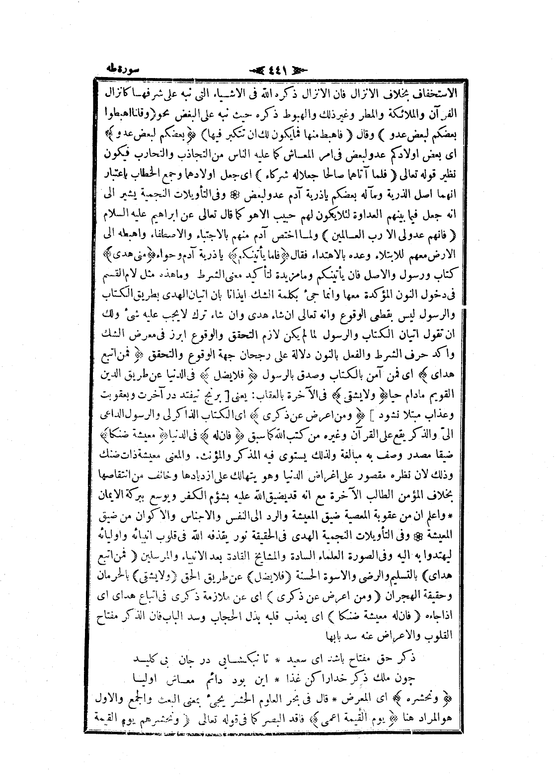 الاستخفاف بخلاف الانزال فان الانزال ذكره الله فى الأشياء التي نبه على شرفها كانزال القرآن والملائكة والمطر وغير ذلك والهبوط ذكره حيث نبه على البغض نحو وَقُلْنَا اهْبِطُوا بَعْضُكُمْ لِبَعْضٍ عَدُوٌّ وقال فَاهْبِطْ مِنْها فَما يَكُونُ لَكَ أَنْ تَتَكَبَّرَ فِيها بَعْضُكُمْ لِبَعْضٍ عَدُوٌّ اى بعض أولادكم عدو لبعض فى امر المعاش كما عليه الناس من التجاذب والتحارب فيكون نظير قوله تعالى فَلَمَّا آتاهُما صالِحاً جَعَلا لَهُ شُرَكاءَ اى جعل أولادهما وجمع الخطاب باعتبار انهما اصل الذرية ومآله بعضكم يا ذرية آدم عدو لبعض وفى التأويلات النجمية يشير الى انه جعل فيما بينهم العداوة لئلا يكون لهم حبيب الا هو كما قال تعالى عن ابراهيم عليه السلام فَإِنَّهُمْ عَدُوٌّ لِي إِلَّا رَبَّ الْعالَمِينَ ولما اختص آدم منهم بالاجتباء والاصطفاء واهبطه الى الأرض معهم للابتلاء وعده بالاهتداء فقال فَإِمَّا يَأْتِيَنَّكُمْ يا ذرية آدم وحواء مِنِّي هُدىً كتاب ورسول والأصل فان يأتينكم وما مزيدة لتأكيد معنى الشرط وما هذه مثل لام القسم فى دخول النون المؤكدة معها وانما جئ بكلمة الشك إيذانا بان إتيان الهدى بطريق الكتاب والرسول ليس بقطعى الوقوع وانه تعالى ان شاء هدى وان شاء ترك لا يجب عليه شىء ولك ان تقول إتيان الكتاب والرسول لما لم يكن لازم التحقق والوقوع ابرز فى معرض الشك وأكد حرف الشرط والفعل بالنون دلالة على رجحان جهة الوقوع والتحقق فَمَنِ اتَّبَعَ هُدايَ اى فمن آمن بالكتاب وصدق بالرسول فَلا يَضِلُّ فى الدنيا عن طريق الدين القويم مادام حيا وَلا يَشْقى فى الآخرة بالعقاب: يعنى [برنج نيفتد در آخرت وبعقوبت وعذاب مبتلا نشود] وَمَنْ أَعْرَضَ عَنْ ذِكْرِي اى الكتاب الذاكر لى والرسول الداعي الىّ والذكر يقع على القرآن وغيره من كتب الله كما سبق فَإِنَّ لَهُ فى الدنيا مَعِيشَةً ضَنْكاً ضيقا مصدر وصف به مبالغة ولذلك يستوى فيه المذكر والمؤنث. والمعنى معيشة ذات ضنك وذلك لان نظره مقصور على اغراض الدنيا وهو يتهالك على ازديادها وخائف من انتقاصها بخلاف المؤمن الطالب الآخرة مع انه قد يضيق الله عليه بشؤم الكفر ويوسع ببركة الايمان واعلم ان من عقوبة المعصية ضيق المعيشة والرد الى النفس والأجناس والأكوان من ضيق المعيشة وفى التأويلات النجمية الهدى فى الحقيقة نور يقذفه الله فى قلوب أنبيائه وأوليائه ليهتدوا به اليه وفى الصورة العلماء السادة والمشايخ القادة بعد الأنبياء والمرسلين فَمَنِ اتَّبَعَ هُدايَ بالتسليم والرضى والاسوة الحسنة فَلا يَضِلُّ عن طريق الحق وَلا يَشْقى بالحرمان وحقيقة الهجران وَمَنْ أَعْرَضَ عَنْ ذِكْرِي اى عن ملازمة ذكرى فى اتباع هداى اى إذا جاءه فَإِنَّ لَهُ مَعِيشَةً ضَنْكاً اى يعذب قلبه بذل الحجاب وسد الباب فان الذكر مفتاح القلوب والاعراض عنه سد بابها