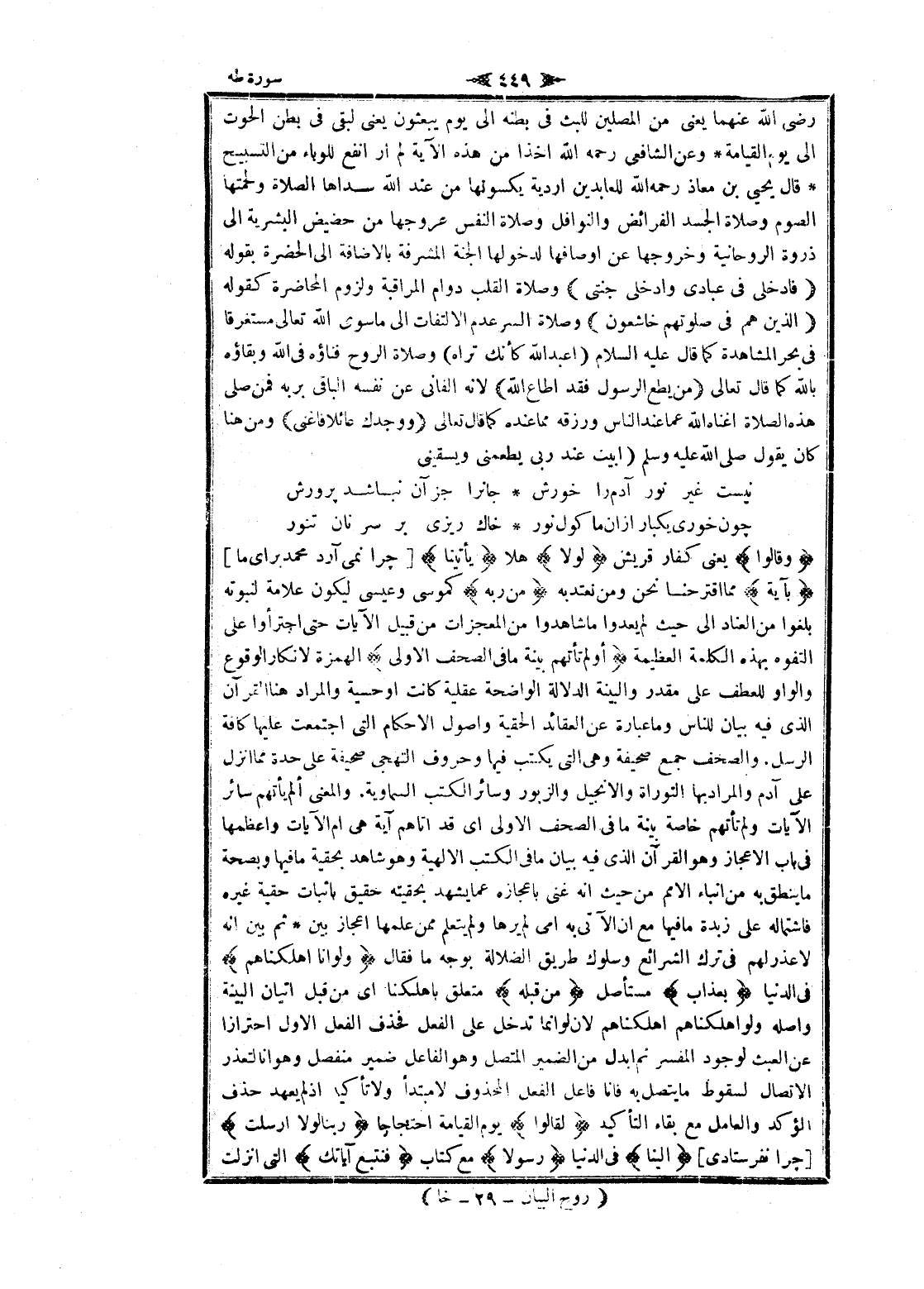 رضى الله عنهما يعنى من المصلين للبث فى بطنه الى يوم يبعثون يعنى لبقى فى بطن الحوت الى يوم القيامة وعن الشافعي رحمه الله أخذا من هذه الآية لم ار انفع للوباء من التسبيح قال يحيى بن معاذ رحمه الله للعابدين اردية يكسونها من عند الله سداها الصلاة ولحمتها الصوم وصلاة الجسد الفرائض والنوافل وصلاة النفس عروجها من حضيض البشرية الى ذروة الروحانية وخروجها عن أوصافها لدخولها الجنة المشرفة بالاضافة الى الحضرة بقوله فَادْخُلِي فِي عِبادِي وَادْخُلِي جَنَّتِي وصلاة القلب دوام المراقبة ولزوم المحاضرة كقوله الَّذِينَ هُمْ فِي صَلاتِهِمْ خاشِعُونَ وصلاة السر عدم الالتفات الى ما سوى الله تعالى مستغرقا فى بحر المشاهدة كما قال عليه السلام (اعبد الله كأنك تراه) وصلاة الروح فناؤه فى الله وبقاؤه بالله كما قال تعالى مَنْ يُطِعِ الرَّسُولَ فَقَدْ أَطاعَ اللَّهَ لانه الفاني عن نفسه الباقي بربه فمن صلى هذه الصلاة أغناه الله عما عند الناس ورزقه مما عنده كما قال تعالى وَوَجَدَكَ عائِلًا فَأَغْنى ومن هنا كان يقول صلى الله عليه وسلم (أبيت عند ربى يطعمنى ويسقينى