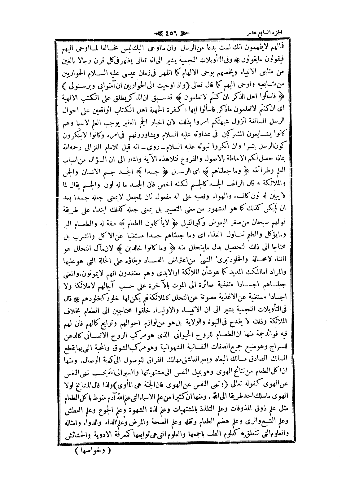 فمالهم لا يفهمون انك لست بدعا من الرسل وان ما اوحى إليك ليس مخالفا لما اوحى إليهم فيقولون ما يقولون وفى التأويلات النجمية يشير الى انه تعالى يظهر فى كل قرن رجالا بالغين من متابعى الأنبياء ويخصهم بوحي الإلهام كما اظهر فى زمان عيسى عليه السلام الحواريين من متابعيه واوحى إليهم كما قال تعالى وَإِذْ أَوْحَيْتُ إِلَى الْحَوارِيِّينَ أَنْ آمِنُوا بِي وَبِرَسُولِي فَسْئَلُوا أَهْلَ الذِّكْرِ إِنْ كُنْتُمْ لا تَعْلَمُونَ قد سبق ان الذكر يطلق على الكتب الالهية اى ان كنتم لا تعلمون ما ذكر فاسألوا ايها الكفرة الجهلة اهل الكتاب الواقفين على احوال الرسل السالفة لتزول شبهتكم أمروا بذلك لان اخبار الجم الغفير يوجب العلم لا سيما وهم كانوا يشايعون المشركين فى عداوته عليه السلام ويشاورونهم فى امره وكانوا لا ينكرون كون الرسل بشرا وان أنكروا نبوته عليه السلام- روى- انه قيل للامام الغزالي رحمه الله بماذا حصل لكم الإحاطة بالأصول والفروع فتلا هذه الآية وأشار الى ان السؤال من اسباب العلم وطرائقه وَما جَعَلْناهُمْ اى الرسل جَسَداً الجسد جسم الإنسان والجن والملائكة قال الراغب الجسد كالجسم لكنه أخص فان الجسد ما له لون والجسم يقال لما لا يبين له لون كالماء والهواء ونصبه على انه مفعول ثان للجعل لا بمعنى جعله جسدا بعد ان لم يكن كذلك كما هو المشهور من معنى التصيير بل بمعنى جعله كذلك ابتداء على طريقة قولهم سبحان من صغر البعوض وكبر الفيل لا يَأْكُلُونَ الطَّعامَ؟؟؟ فة له والطعام البر وما يؤكل والطعم تناول الغذاء اى وما جعلناهم جسدا مستغنيا عن الاكل والشرب بل محتاجا الى ذلك لتحصيل بدل ما يتحلل منه وَما كانُوا خالِدِينَ لان مآل التحلل هو الفناء لا محالة والخلود تبرئ الشيء من اعتراض الفساد وبقاؤه على الحالة التي هو عليها والمراد اما المكث المديد كما هو شأن الملائكة او الابدى وهم معتقدون انهم لا يموتون. والمعنى جعلناهم أجسادا متغذية صائرة الى الموت بالآخرة على حسب آجالهم لا ملائكة ولا أجسادا مستغنية عن الاغذية مصونة عن التحلل كالملائكة فلم يكن لها خلود كخلودهم قال فى التأويلات النجمية يشير الى ان الأنبياء والأولياء خلقوا محتاجين الى الطعام بخلاف الملائكة وذلك لا يقدح فى النبوة والولاية بل هو من لوازم أحوالهم وتوابع كمالهم فان لهم فيه فوائد جمة منها ان الطعام للروح الحيواني الذي هو مركب الروح الإنساني كالدهن للسراج وهو منبع جميع الصفات النفسانية الشهوانية وهو مركب الشوق والمحبة التي بها يقطع السالك الصادق مسالك البعاد ويعبر العاشق مهالك الفراق للوصول الى كعبة الوصال. ومنها ان أكل الطعام من نتائج الهوى وهو يميل النفس الى مشتهياتها والسير الى الله بحسب نهى النفس عن الهوى كقوله تعالى وَنَهَى النَّفْسَ عَنِ الْهَوى فَإِنَّ الْجَنَّةَ هِيَ الْمَأْوى ولذا قال المشايخ لولا الهوى ما سلك أحد طريقا الى الله. ومنها ان كثيرا من علم الأسماء التي علم الله آدم منوط بأكل الطعام مثل علم ذوق المذوقات وعلم التلذذ بالمشتهيات وعلم لذة الشهوة وعلم الجوع وعلم العطش وعلم الشبع والري وعلم هضم الطعام وثقله وعلم الصحة والمرض وعلم الداء والدواء وأمثاله والعلوم التي تتعلق به كعلوم الطب بأجمعها والعلوم التي هى توابعها كمعرفة الادوية والحشائش