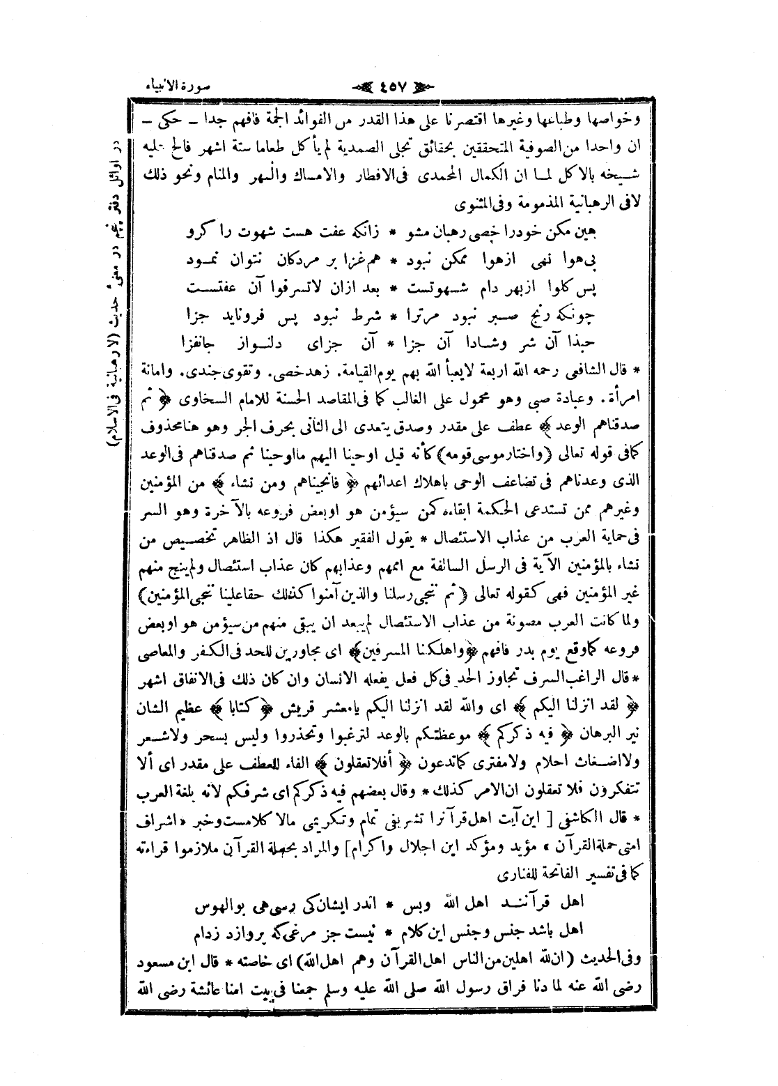 قال الشافعي رحمه الله اربعة لا يعبأ الله بهم يوم القيامة. زهد خصى. وتقوى جندى. وامانة امرأة. وعبادة صبى وهو محمول على الغالب كما فى المقاصد الحسنة للامام السخاوي ثُمَّ صَدَقْناهُمُ الْوَعْدَ عطف على مقدر وصدق يتعدى الى الثاني بحرف الجر وهو هنا محذوف كما فى قوله تعالى وَاخْتارَ مُوسى قَوْمَهُ كأنه قيل أوحينا إليهم ما أوحينا ثم صدقناهم فى الوعد الذي وعدناهم فى تضاعف الوحى باهلاك أعدائهم فَأَنْجَيْناهُمْ وَمَنْ نَشاءُ من المؤمنين وغيرهم ممن تستدعى الحكمة إبقاءه كمن سيؤمن هو او بعض فروعه بالآخرة وهو السر فى حماية العرب من عذاب الاستئصال يقول الفقير هكذا قال إذ الظاهر تخصيص من نشاء بالمؤمنين الآية فى الرسل السالفة مع أممهم وعذابهم كان عذاب استئصال ولم ينج منهم غير المؤمنين فهى كقوله تعالى ثُمَّ نُنَجِّي رُسُلَنا وَالَّذِينَ آمَنُوا كَذلِكَ حَقًّا عَلَيْنا نُنْجِ الْمُؤْمِنِينَ ولما كانت العرب مصونة من عذاب الاستئصال لم يبعد ان يبقى منهم من سيؤمن هو او بعض فروعه كما وقع يوم بدر فافهم وَأَهْلَكْنَا الْمُسْرِفِينَ اى مجاورين للحد فى الكفر والمعاصي قال الراغب السرف تجاوز الحد فى كل فعل يفعله الإنسان وان كان ذلك فى الانفاق أشهر لَقَدْ أَنْزَلْنا إِلَيْكُمْ اى والله لقد أنزلنا إليكم يا معشر قريش كِتاباً عظيم الشان نير البرهان فِيهِ ذِكْرُكُمْ موعظتكم بالوعد لترغبوا وتحذروا وليس بسحر ولا شعر ولا أضغاث أحلام ولا مفترى كما تدعون أَفَلا تَعْقِلُونَ الفاء للعطف على مقدر اى ألا تتفكرون فلا تعقلون ان الأمر كذلك وقال بعضهم فيه ذكركم اى شرفكم لانه بلغة العرب قال الكاشفى [اين آيت اهل قرآنرا تشريفى تمام وتكريمى مالا كلامست وخبر «اشراف أمتي حملة القرآن» مؤيد ومؤكد اين إجلال وإكرام] والمراد بحملة القرآن ملازموا قراءته كما فى تفسير الفاتحة للفنارى اهل قرآنند اهل الله وبس اندر ايشان كى رسى هى بو الهوس اهل باشد جنس وجنس اين كلام نيست جز مرغى كه پروازد ز دام وفى الحديث (ان لله أهلين من الناس اهل القرآن وهم اهل الله) اى خاصته قال ابن مسعود رضى الله عنه لما دنا فراق رسول الله صلى الله عليه وسلم جمعنا فى بيت أمنا عائشة رضى الله