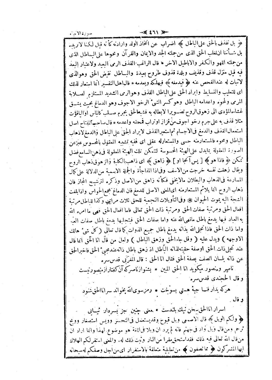 بَلْ نَقْذِفُ بِالْحَقِّ عَلَى الْباطِلِ إضراب عن اتخاذ الولد وإرادته كأنه قيل لكنا لا نريده بل شأننا ان تغلب الحق الذي من جملته الجد والايمان والقرآن ونحوها على الباطل الذي من جملته اللهو والكفر والأباطيل الاخر قال الراغب القذف الرمي البعيد ولاعتبار البعد فيه قيل منزل قذف وقذيف وبلدة قذوف طروح بعيدة والباطل نقيض الحق وهو الذي لا ثبات له عند الفحص عنه فَيَدْمَغُهُ فيهلكه ويعدمه قال اهل التفسير انما استعار لذلك اى للتعليب والتسليط وإيراد الحق على الباطل القذف وهو الرمي الشديد المستلزم لصلابة المرمى ولمحوه واعدامه الباطل وهو كسر الشيء الرخو الأجوف وهو الدماغ بحيث يشق غشاءه المؤدى الى زهوق الروح تصويرا لابطاله به فشبه الحق بجرم صلب كالماس او الياقوت مثلا قذف به على جرم رخو أجوف من قزاز او تراب فمحقه وأعدمه قال صاحب المفتاح اصل استعمال القذف والدمغ فى الأجسام ثم استعير القذف لا يراد الحق على الباطل والدمغ لا ذهاب الباطل ومحوه فالمستعار منه حسى والمستعار له عقلى اى ففيه تشبيه المعقول بالمحسوس عبر عن الصورة المعقولة بما يدل على الهيئة المحسوسة لتتمكن تلك الهيئة المعقولة فى ذهن السامع فضل تمكن فَإِذا هُوَ [پس آنجا او] زاهِقٌ اى ذاهب بالكلية والزهوق ذهاب الروح ويقال زهقت نفسه خرجت من الأسف وفى إذا المفاجأة والجملة الاسمية من الدلالة على كمال المسارعة فى الذهاب والبطلان ما لا يخفى فكأنه زاهق من الأصل وذكره لترشيح المجاز فان ذهاب الروح انما يلائم المستعار منه اى المعنى الأصلي للدمغ فان الدماغ مجمع الحواس وإذا بلغت الشجة اليه يموت الحيوان وفى التأويلات النجمية للحق ثلاث مراتب وكذا للباطل مرتبة افعال الحق ومرتبة صفات الحق ومرتبة ذات الحق تعالى فاما افعال الحق فهى ما امره الله به العباد فبها يدمغ باطل ما نهى الله عنه واما صفات الحق فبتجليها يدمغ باطل صفات العبد واما ذات الحق فاذا تجلى الله بذاته يدمغ باطل جميع الذوات كما قال تعالى كُلُّ شَيْءٍ هالِكٌ إِلَّا وَجْهَهُ ويدل عليه وَقُلْ جاءَ الْحَقُّ وَزَهَقَ الْباطِلُ ولعل من قال انا الحق انما قال عند تجلى ذات الحق او صفة حقيته لذاته الباطل إذ زهق باطل ذاته عند مجيئ الحق فاخبر الحق عن ذاته بلسان اتصف بصفة الحق فقال انا الحق: قال المغربي قدس سره