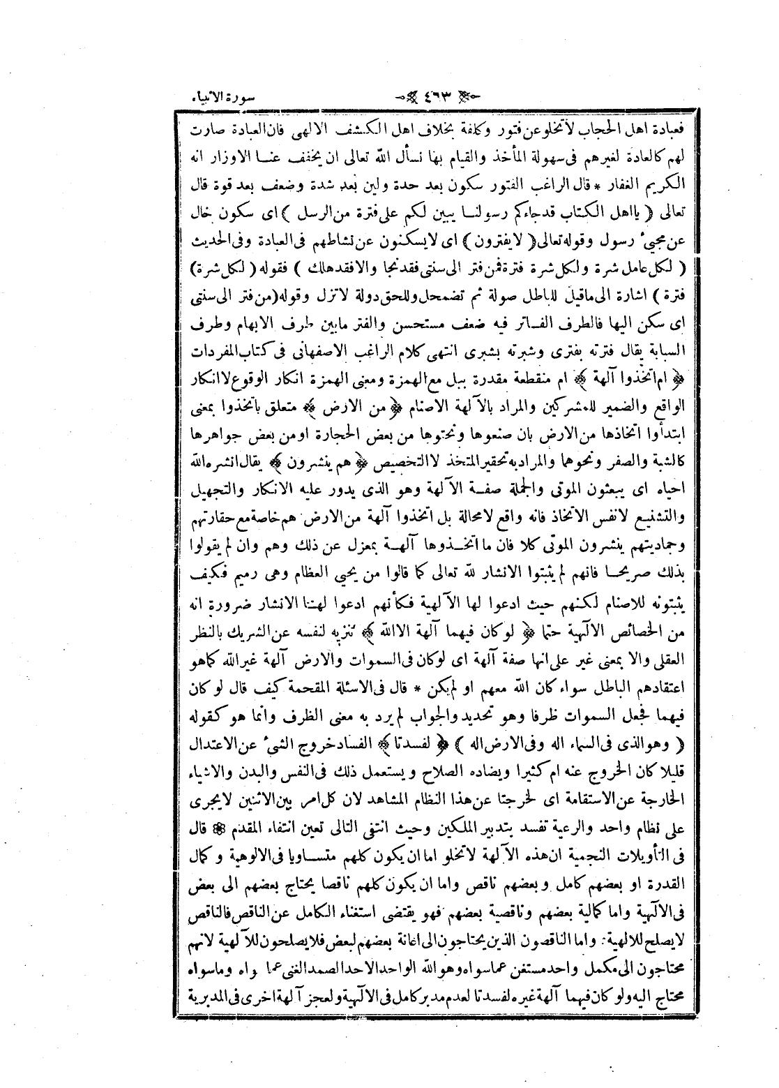فعبادة اهل الحجاب لا تخلو عن فتور وكلفة بخلاف اهل الكشف الإلهي فان العبادة صارت لهم كالعادة لغيرهم فى سهولة المأخذ والقيام بها نسأل الله تعالى ان يخفف عنا الأوزار انه الكريم الغفار قال الراغب الفتور سكون بعد حدة ولين بعد شدة وضعف بعد قوة قال تعالى يا أَهْلَ الْكِتابِ قَدْ جاءَكُمْ رَسُولُنا يُبَيِّنُ لَكُمْ عَلى فَتْرَةٍ مِنَ الرُّسُلِ اى سكون خال عن مجيئ رسول وقوله تعالى لا يَفْتُرُونَ اى لا يسكنون عن نشاطهم فى العبادة وفى الحديث (لكل عامل شرة ولكل شرة فترة فمن فتر الى سنتى فقد نجا والا فقد هلك) فقوله (لكل شرة) فترة) اشارة الى ما قيل للباطل صولة ثم تضمحل وللحق دولة لا تزل وقوله (من فتر الى سنتى اى سكن إليها فالطرف الفاتر فيه ضعف مستحسن والفتر ما بين طرف الإبهام وطرف السبابة يقال فترته بفترى وشبرته بشبرى انتهى كلام الراغب الاصفهانى فى كتاب المفردات أَمِ اتَّخَذُوا آلِهَةً أم منقطعة مقدرة ببل مع الهمزة ومعنى الهمزة انكار الوقوع لا انكار الواقع والضمير للمشركين والمراد بالآلهة الأصنام مِنَ الْأَرْضِ متعلق باتخذوا بمعنى ابتدأوا اتخاذها من الأرض بان صنعوها ونحتوها من بعض الحجارة او من بعض جواهرها كالشبة والصفر ونحوهما والمراد به تحقير المتخذ لا التخصيص هُمْ يُنْشِرُونَ يقال انشره الله أحياه اى يبعثون الموتى والجملة صفة الآلهة وهو الذي يدور عليه الإنكار والتجهيل والتشنيع لا نفس الاتخاذ فانه واقع لا محالة بل اتخذوا آلهة من الأرض هم خاصة مع حقارتهم وجماديتهم ينشرون الموتى كلا فان ما اتخذوها آلهة بمعزل عن ذلك وهم وان لم يقولوا بذلك صريحا فانهم لم يثبتوا الانشار لله تعالى كما قالوا من يحيى العظام وهى رميم فكيف يثبتونه للاصنام لكنهم حيث ادعوا لها الإلهية فكأنهم ادعوا لها الانشار ضرورة انه من الخصائص الالهية حتما لَوْ كانَ فِيهِما آلِهَةٌ إِلَّا اللَّهُ تنزيه لنفسه عن الشريك بالنظر العقلي والا بمعنى غير على انها صفة آلهة اى لو كان فى السموات والأرض آلهة غير الله كما هو اعتقادهم الباطل سواء كان الله معهم او لم يكن قال فى الاسئلة المقحمة كيف قال لو كان فيهما فجعل السموات ظرفا وهو تحديد والجواب لم يرد به معنى الظرف وانما هو كقوله وَهُوَ الَّذِي فِي السَّماءِ إِلهٌ وَفِي الْأَرْضِ إِلهٌ لَفَسَدَتا الفساد خروج الشيء عن الاعتدال قليلا كان الخروج عنه أم كثيرا ويضاده الصلاح ويستعمل ذلك فى النفس والبدن والأشياء الخارجة عن الاستقامة اى لخرجتا عن هذا النظام المشاهد لان كل امر بين الاثنين لا يجرى على نظام واحد والرعية تفسد بتدبير الملكين وحيث انتفى التالي تعين انتفاء المقدم قال فى التأويلات النجمية ان هذه الآلهة لا تخلو اما ان يكون كلهم متساويا فى الالوهية وكمال القدرة او بعضهم كامل وبعضهم ناقص واما ان يكون كلهم ناقصا يحتاج بعضهم الى بعض فى الالهية واما كمالية بعضهم وناقصية بعضهم فهو يقتضى استغناء الكامل عن الناقص فالناقص لا يصلح للالهية واما الناقصون الذين يحتاجون الى اعانة بعضهم لبعض فلا يصلحون للآلهية لانهم محتاجون الى مكمل واحد مستغن عما سواه وهو الله الواحد الأحد الصمد الغنى عما سواه وما سواه محتاج اليه ولو كان فيهما آلهة غيره لفسدتا لعدم مدبر كامل فى الالهية ولعجز آلهة اخرى فى المدبرية