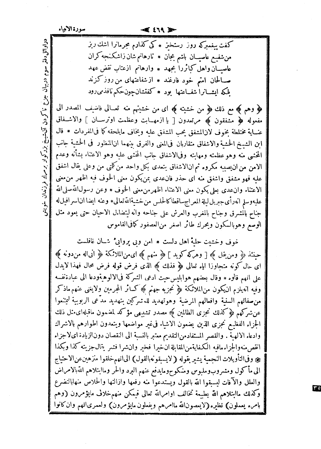 وَهُمْ مع ذلك مِنْ خَشْيَتِهِ اى من خشيتهم منه تعالى فاضيف المصدر الى مفعوله مُشْفِقُونَ مرتعدون [يا از مهابت وعظمت او ترسان] والإشفاق عناية مختلطة بخوف لان المشفق يحب المشفق عليه ويخاف ما يلحقه كما فى المفردات قال ابن الشيخ الخشية والإشفاق متقاربان فى المعنى والفرق بينهما ان المنظور فى الخشية جانب المخشى منه وهو عظمته ومهابته وفى الإشفاق جانب المخشى عليه وهو الاعتناء بشأنه وعدم الامن من ان يصيبه مكروه ثم ان الإشفاق يتعدى بكل واحد من كلمتى من وعلى يقال اشفق عليه فهو مشفق واشفق منه اى حذر فان عدى بمن يكون معنى الخوف فيه اظهر من معنى الاعتناء وان عدى بعلى يكون معنى الاعتناء اظهر من معنى الخوف وعن رسول الله صلى الله عليه وسلم انه رأى جبريل ليلة المعراج ساقطا كالحلس من خشية الله تعالى وعنه ايضا ان اسرافيل له جناح بالمشرق وجناح بالمغرب والعرش على جناحه وانه ليتضاءل الأحيان حتى يعود مثل الوصع وهو بالسكون ويحرك طائر أصغر من العصفور كما فى القاموس