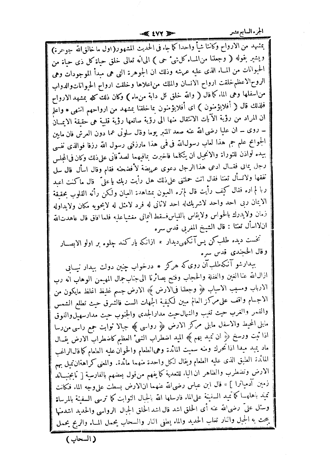 بمشهد من الأرواح وكانتا شيأ واحدا كما جاء فى الحديث المشهور (أول ما خالق الله جوهرة) ويشير بقوله وَجَعَلْنا مِنَ الْماءِ كُلَّ شَيْءٍ حَيٍّ الى انه تعالى خلق حياة كل ذى حياة من الحيوانات من الماء الذي عليه عرشه وذلك ان الجوهرة التي هى مبدأ الموجودات وهى الروح الأعظم خلقت أرواح الإنسان والملك من أعلاها وخلقت أرواح الحيوانات والدواب من أسفلها وهى الماء كما قال وَاللَّهُ خَلَقَ كُلَّ دَابَّةٍ مِنْ ماءٍ وكان ذلك كله بمشهد الأرواح فلذلك قال أَفَلا يُؤْمِنُونَ اى أفلا يؤمنون بما خلقنا بمشهد من أرواحهم انتهى واعلم ان المراد من رؤية الآيات الانتقال منها الى رؤية صانعها رؤية قلبية هى حقيقة الايمان- روى- ان عليا رضى الله عنه صعد المنبر يوما وقال سلونى عما دون العرش فان ما بين الجوانح علم جم هذا لعاب رسول الله فى فمى هذا ما رزقنى رسول الله رزقا فوالذى نفسى بيده لو اذن للتوراة والإنجيل ان يتكلما فاخبرت بما فيهما لصدّقانى على ذلك وكان فى المجلس رجل يمانى فقال ادعى هذا الرجل دعوى عريضة لأفضحنه فقام وقال اسأل قال سل تفقها ولا تسأل تعنتا فقال أنت حملتنى على ذلك هل رأيت ربك يا علىّ قال ما كنت اعبد ربا لم أره فقال كيف رأيت قال لم تره العيون بمشاهدة العيان ولكن رأته القلوب بحقيقة الايمان ربى أحد واحد لا شريك له أحد لا ثانى له فرد لا مثل له لا يحويه مكان ولا يداوله زمان ولا يدرك بالحواس ولا يقاس بالقياس فسقط اليماني مغشيا عليه فلما أفاق قال عاهدت الله ان لا اسأل تعنتا: قال الشيخ المغربي قدس سره
