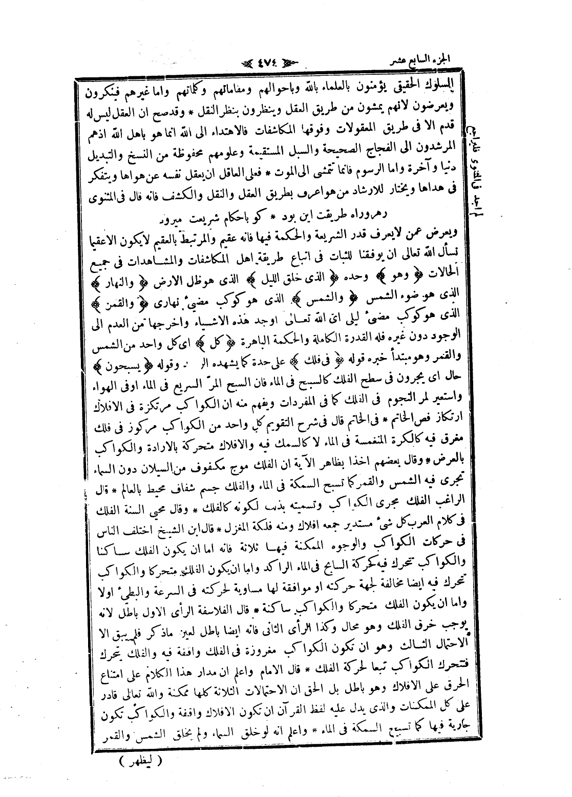 ويعرض عمن لا يعرف قدر الشريعة والحكمة فيها فانه عقيم والمرتبط بالعقيم لا يكون الا عقيما نسأل الله تعالى ان يوفقنا للثبات فى اتباع طريقة اهل المكاشفات والمشاهدات فى جميع الحالات وَهُوَ وحده الَّذِي خَلَقَ اللَّيْلَ الذي هو ظل الأرض وَالنَّهارَ الذي هو ضوء الشمس وَالشَّمْسَ الذي هو كوكب مضيئ نهارى وَالْقَمَرَ الذي هو كوكب مضئ ليلى اى الله تعالى أوجد هذه الأشياء وأخرجها من العدم الى الوجود دون غيره فله القدرة الكاملة والحكمة الباهرة كُلٌّ اى كل واحد من الشمس والقمر وهو مبتدأ خبره قوله فِي فَلَكٍ على حدة كما يشهده؟؟؟ وقوله يَسْبَحُونَ حال اى يجرون فى سطح الفلك كالسبح فى الماء فان السبح المرّ السريع فى الماء او فى الهواء واستعير لمر النجوم فى الفلك كما فى المفردات ويفهم منه ان الكواكب مرتكزة فى الافلاك ارتكاز فص الخاتم فى الخاتم قال فى شرح التقويم كل واحد من الكواكب مركوز فى فلك مغرق فيه كالكرة المنغمسة فى الماء لا كالسمك فيه والافلاك متحركة بالارادة والكواكب بالعرض وقال بعضهم أخذا بظاهر الآية ان الفلك موج مكفوف من السيلان دون السماء تجرى فيه الشمس والقمر كما تسبح السمكة فى الماء والفلك جسم شفاف محيط بالعالم قال الراغب الفلك مجرى الكواكب وتسميته بذلك لكونه كالفلك وقال محيى السنة الفلك فى كلام العرب كل شىء مستدير جمعه أفلاك ومنه فلكة المغزل قال ابن الشيخ اختلف الناس فى حركات الكواكب والوجوه الممكنة فيها ثلاثة فانه اما ان يكون الفلك ساكنا والكواكب تتحرك فيه كحركة السابح فى الماء الراكد واما ان يكون الفلك متحركا والكواكب تتحرك فيه ايضا مخالفة لجهة حركته او موافقة لها مساوية لحركته فى السرعة والبطء اولا واما ان يكون الفلك متحركا والكواكب ساكنة قال الفلاسفة الرأى الاول باطل لانه يوجب خرق الفلك وهو محال وكذا الرأى الثاني فانه ايضا باطل لعين ما ذكر فلم يبق الا الاحتمال الثالث وهو ان تكون الكواكب مغروزة فى الفلك واقفة فيه والفلك يتحرك فتتحرك الكواكب طبعا لحركة الفلك قال الامام واعلم ان مدار هذا الكلام على امتناع الحرق على الافلاك وهو باطل بل الحق ان الاحتمالات الثلاثة كلها ممكنة والله تعالى قادر على كل الممكنات والذي يدل عليه لفظ القرآن ان تكون الافلاك واقفة والكواكب تكون جارية فيها كما تسبيح السمكة فى الماء واعلم انه لو خلق السماء ولم يخلق الشمس والقمر