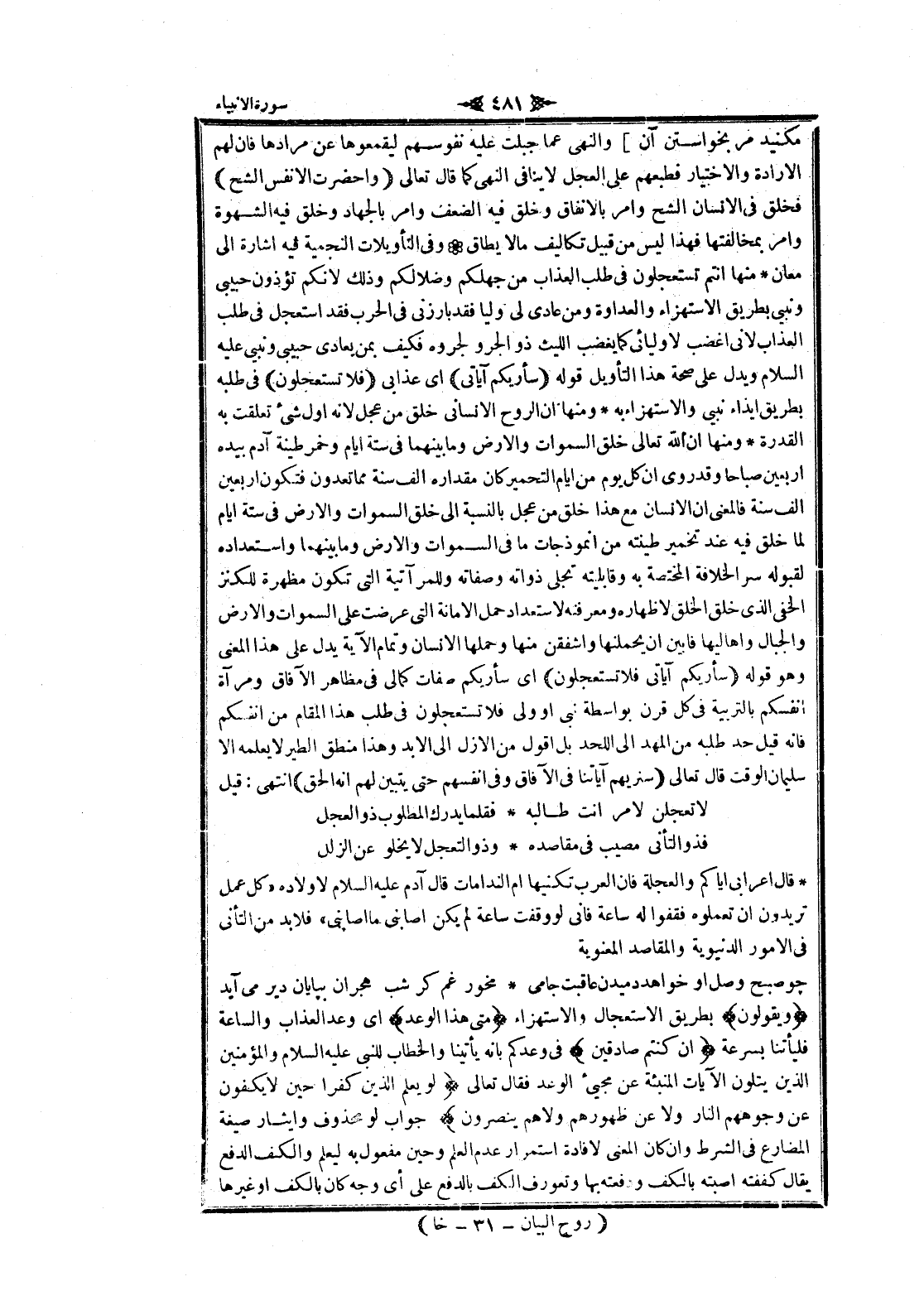 مكنيد مر بخواستن آن] والنهى عما جبلت عليه نفوسهم ليقمعوها عن مرادها فان لهم الارادة والاختيار فطبعهم على العجل لا ينافى النهى كما قال تعالى وَأُحْضِرَتِ الْأَنْفُسُ الشُّحَّ فخلق فى الإنسان الشح وامر بالإنفاق وخلق فيه الضعف وامر بالجهاد وخلق فيه الشهوة وامر بمخالفتها فهذا ليس من قبيل تكاليف ما لا يطاق وفى التأويلات النجمية فيه اشارة الى معان منها أنتم تستعجلون فى طلب العذاب من جهلكم وضلالكم وذلك لانكم تؤذون حبيبى ونبيى بطريق الاستهزاء والعداوة ومن عادى لى وليا فقد بارزني فى الحرب فقد استعجل فى طلب العذاب لانى اغضب لاوليائى كما يغضب الليث ذو الجرو لجروه فكيف بمن يعادى حبيبى ونبيى عليه السلام ويدل على صحة هذا التأويل قوله سَأُرِيكُمْ آياتِي اى عذابى فَلا تَسْتَعْجِلُونِ فى طلبه بطريق إيذاء نبيى والاستهزاء به ومنها ان الروح الإنساني خلق من عجل لانه أول شىء تعلقت به القدرة ومنها ان الله تعالى خلق السموات والأرض وما بينهما فى ستة ايام وخمر طينة آدم بيده أربعين صباحا وقد روى ان كل يوم من ايام التحمير كان مقداره الف سنة مما تعدون فتكون أربعين الف سنة فالمعنى ان الإنسان مع هذا خلق من عجل بالنسبة الى خلق السموات والأرض فى ستة ايام لما خلق فيه عند تخمير طينته من انموذجات ما فى السموات والأرض وما بينهما واستعداده لقبوله سر الخلافة المختصة به وقابليته تجلى ذواته وصفاته وللمرآتية التي تكون مظهرة للكنز الخفي الذي خلق الخلق لاظهاره ومعرفته لاستعداد حمل الامانة التي عرضت على السموات والأرض والجبال وأهاليها فابين ان يحملنها وأشفقن منها وحملها الإنسان وتمام الآية يدل على هذا المعنى وهو قوله سَأُرِيكُمْ آياتِي فَلا تَسْتَعْجِلُونِ اى سأريكم صفات كمالى فى مظاهر الآفاق ومرآة أنفسكم بالتربية فى كل قرن بواسطة نبى او ولى فلا تستعجلون فى طلب هذا المقام من أنفسكم فانه قيل حد طلبه من المهد الى اللحد بل أقول من الأزل الى الابد وهذا منطق الطير لا يعلمه الا سليمان الوقت قال تعالى سَنُرِيهِمْ آياتِنا فِي الْآفاقِ وَفِي أَنْفُسِهِمْ حَتَّى يَتَبَيَّنَ لَهُمْ أَنَّهُ الْحَقُّ انتهى: قيل لا تعجلن لامر أنت طالبه فقلما يدرك المطلوب ذو العجل فذو التأنى مصيب فى مقاصده وذو التعجل لا يخلو عن الزلل قال أعرابي إياكم والعجلة فان العرب تكنيها أم الندامات قال آدم عليه السلام لاولاده «كل عمل تريدون ان تعملوه فقفوا له ساعة فانى لو وقفت ساعة لم يكن أصابني ما أصابني» فلابد من التأنى فى الأمور الدنيوية والمقاصد المعنوية