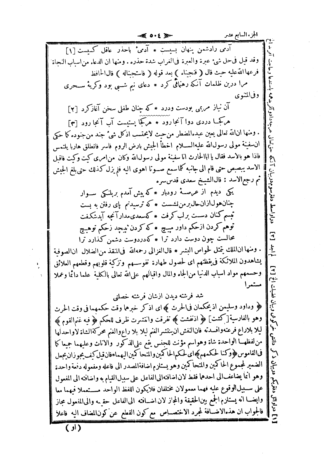 . ومنها ان الله تعالى يعين عبده المضطر من حيث لا يحتسب إذ كل شىء جند من جنوده كما حكى ان سفينة مولى رسول الله عليه السلام اخطأ الجيش بأرض الروم فاسر فانطلق هاربا يلتمس فاذا هو بالأسد فقال يا أبا الحارث انا سفينة مولى رسول الله وكان من امرى كيت وكيت فاقبل الأسد يبصبص حتى قام الى جانبه كلما سمع صوتا أهوى اليه فلم يزل كذلك حتى بلغ الجيش ثم رجع الأسد: قال الشيخ سعدى قدس سره