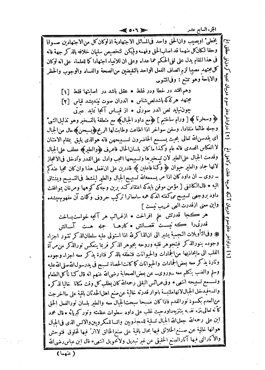 يخطئ او يصيب وان الحق واحد فى المسائل الاجتهادية إذ لو كان كل من الاجتهادين صوابا وحقا لكان كل منهما قد أصاب الحق وفهمه ولم يكن لتخصيص سليمان خلافه بالذكر جهة فانه فى هذا المقام يدل على نفى الحكم عما عداه وعلى ان للانبياء اجتهادا كما للعلماء على انه لو كان كل مجتهد مصيبا لزم اتصاف الفعل الواحد بالنقيضين من الصحة والفساد والوجوب والحظر والإباحة وهو ممتنع: وفى المثنوى