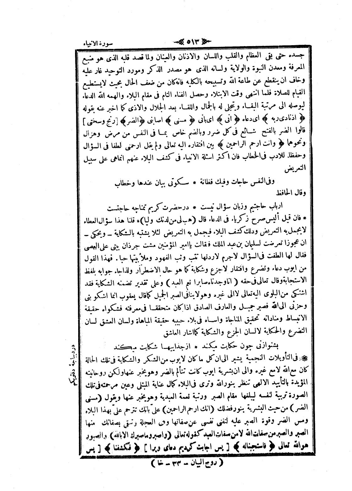فان قيل أليس صرح زكرياء فى الدعاء قال فَهَبْ لِي مِنْ لَدُنْكَ وَلِيًّا قلنا هذا سؤال العطاء لا يجمل به التعريض وذلك كشف البلاء فيجمل به التعريض لئلا يشتبه بالشكاية- ويحكى- ان عجوزا تعرضت لسليمان بن عبد الملك فقالت يا امير المؤمنين مشت جرذان بيتي على العصى فقال لها ألطفت فى السؤال لا جرم لاردنها تثب وثب الفهود وملأ بيتها حبا. فهذا القول من أيوب دعاء وتضرع وافتقار لا جزع وشكاية كما هو حال الاضطرار ولذا جاء جوابه بلفظ الاستجابة وقال تعالى فى حقه إِنَّا وَجَدْناهُ صابِراً نِعْمَ الْعَبْدُ وعلى تقدير تضمنه الشكاية فقد اشتكى من البلوى اليه تعالى لا الى غيره وهو لا ينافى الصبر الجميل كما قال يعقوب انما أشكو بثي وحزنى الى الله فصبر جميل والعارف الصادق إذا كان متحققا فى معرفته فشكواه حقيقة الانبساط ومناداته تحقيق المناجاة واساه فى بلاء حبيبه حقيقة المباهاة ولسان العشق لسان التضرع والحكاية لا لسان الجزع والشكاية كما أشار العاشق