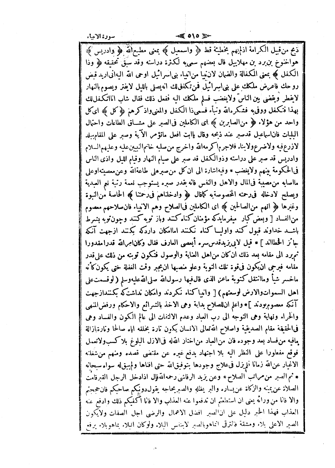 ذبح من قبيل الكرامة إذ لم يهم بخطيئة قط وَإِسْماعِيلَ بمعنى مطيع الله وَإِدْرِيسَ هو أخنوخ بن برد بن مهلاييل قال بعضهم سمى به لكثرة دراسته وقد سبق تحقيقه وَذَا الْكِفْلِ بمعنى الكفالة والضمان لان نبيا من أنبياء بنى إسرائيل اوحى الله اليه انى أريد قبض روحك فاعرض ملكك على بنى إسرائيل فمن تكفل لك انه يصلى بالليل لا يفتر ويصوم بالنهار لا يفطر ويقضى بين الناس ولا يغضب فسلم ملكك اليه ففعل ذلك فقال شاب انا اتكفل لك بهذا فتكفل ووفى به فشكره الله ونبأه فسمى ذا الكفل والمعنى واذكرهم كُلٌّ اى كل واحد من هؤلاء مِنَ الصَّابِرِينَ اى الكاملين فى الصبر على مشاق الطاعات واحتمال البليات فان إسماعيل قد صبر عند ذبحه وقال يا أبت افعل ما تؤمر الآية وصبر على المقام ببلد لازرع فيه ولا ضرع ولا بناء فلا جرم أكرمه الله واخرج من صلبه خاتم النبيين عليه وعليهم السلام وإدريس قد صبر على دراسته وذو الكفل قد صبر على صيام النهار وقيام الليل وأذى الناس فى الحكومة بينهم ولا يغضب وفيه اشارة الى ان كل من صبر على طاعة الله وعن معصيته او على ما أصابه من مصيبة فى المال والأهل والنفس فانه بقدر صبره يستوجب نعمة رتبة نعم العبدية ويصلح لادخاله فى رحمته المخصوصة به كما قال وَأَدْخَلْناهُمْ فِي رَحْمَتِنا الخاصة من النبوة وغيرها إِنَّهُمْ مِنَ الصَّالِحِينَ اى الكاملين فى الصلاح وهم الأنبياء فان صلاحهم معصوم من الفساد [وبعض كبار ميفرمايد كه مؤمنان كناه كنند وباز توبه كنند و چون توبه بشرط باشد خداوند قبول كند وأوليا كناه نكنند اما إمكان دارد كه بكنند از جهت آنكه جائز الخطااند] قيل لابى يزيد قدس سره أيعصى العارف فقال وكان امر الله قدرا مقدورا ثم يرد الى مقامه بعد ذلك ان كان من اهل العناية والوصول فتكون توبته من ذلك على قدر مقامه فيرجى ان يكون فى قوة تلك التوبة وعلو منصبها ان يجبر وقت الغفلة حتى يكون كأنه ما خسر شيأ وما انتقل كتوبة ما عز الذي قال فيها رسول الله صلى الله عليه وسلم (لو قسمت على اهل السموات والأرض لوسعتهم) [وانبيا كناه نكردند وإمكان نداشت كه بكنند از جهت آنكه معصوم بودند] واعلم ان للصلاح بداية وهى الاخذ بالشرائع والاحكام ورفض المنهي والحراء ونهاية وهى التوجه الى رب العباد وعدم الالتفات الى عالم الكون والفساد وهى فى الحقيقة مقام الصديقية وإصلاح الله تعالى الإنسان يكون تارة بخلقه إياه صالحا وتارة بازالة ما فيه من فساد بعد وجوده فان من العباد من اختار الله له فى الأزل البلوغ بلا كسب ولا تعمل فوقع مفطورا على النظر اليه بلا اجتهاد بدفع غيره عن مقتضى قصده ومنهم من شغلته الأغيار عن الله زمانا فلم يزل فى علاج وجودها بتوفيق الله حتى أفناها ولم يبق له سواه سبحانه ثم الصبر من مراتب الصلاح وعن يزيد الرقاشي رحمه الله قال إذا دخل الرجل القبر قامت الصلاة عن يمينه والزكاة عن يساره والبر يظله والصبر يحاجه يقول دونكم صاحبكم فان حججتم والا فانا من ورائه يعنى ان استطعتم ان تدفعوا عنه العذاب والا فانا أكفيكم ذلك وادفع عنه العذاب فهذا الخبر دليل على ان الصبر أفضل الأعمال والرضى أجل الصفات ولا يكون الصبر الا على بلاء ومشقة فالترقى انما هو بالصبر لا بنفس البلاء ولو كان البلاء بما هو بلاء يرفع