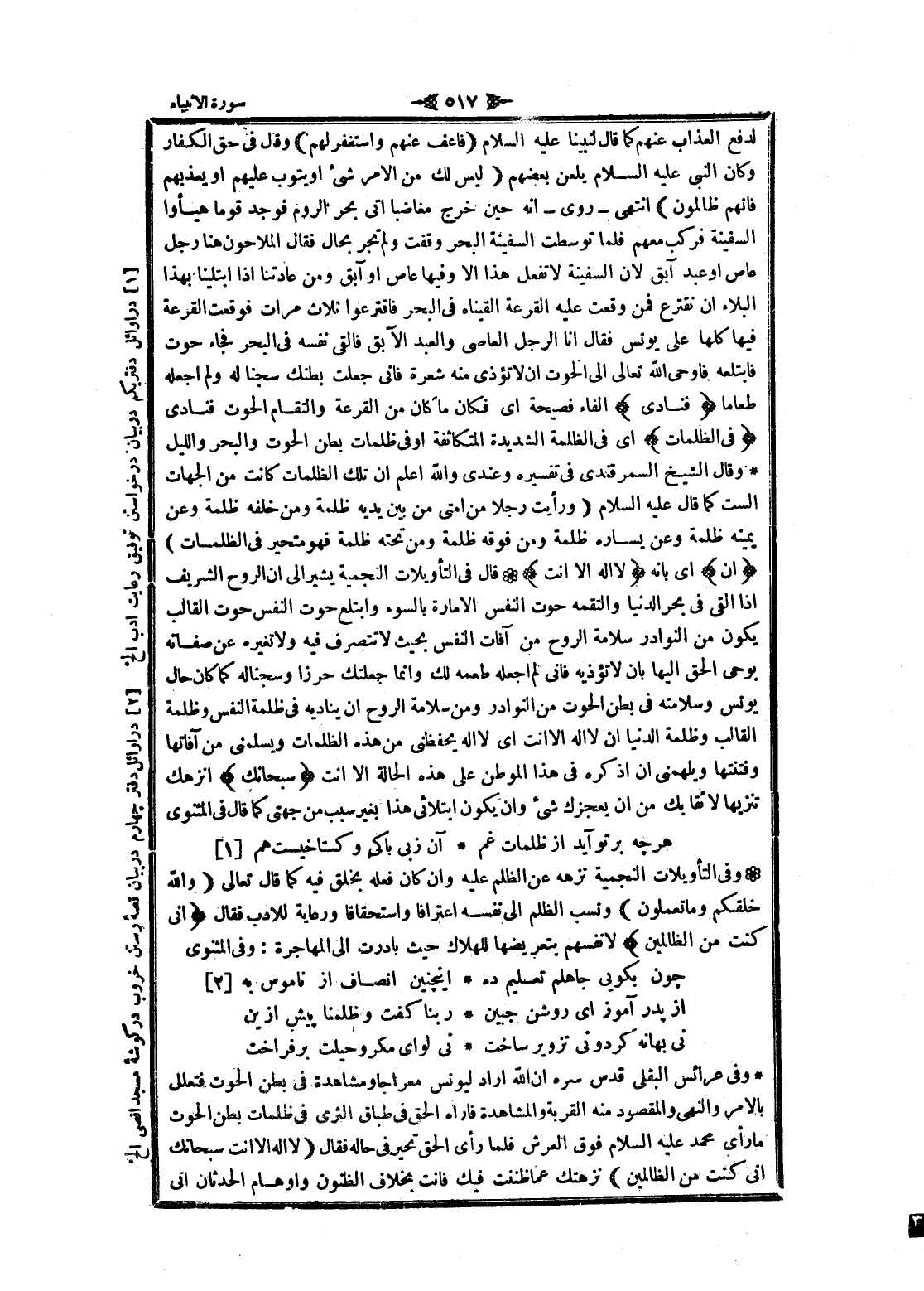 لدفع العذاب عنهم كما قال لنبينا عليه السلام (فاعف عنهم واستغفر لهم) وقال فى حق الكفار وكان النبي عليه السلام يلعن بعضهم (ليس لك من الأمر شىء او يتوب عليهم او يعذبهم فانهم ظالمون) انتهى- روى- انه حين خرج مغاضبا اتى بحر الروم فوجد قوما هيأوا السفينة فركب معهم فلما توسطت السفينة البحر وقفت ولم تجر بحال فقال الملاحون هنا رجل عاص او عبد آبق لان السفينة لا تفعل هذا الا وفيها عاص او آبق ومن عادتنا إذا ابتلينا بهذا البلاء ان نقترع فمن وقعت عليه القرعة ألقيناه فى البحر فاقترعوا ثلاث مرات فوقعت القرعة فيها كلها على يونس فقال انا الرجل العاصي والعبد الآبق فالقى نفسه فى البحر فجاء حوت فابتلعه فاوحى الله تعالى الى الحوت ان لا تؤذى منه شعرة فانى جعلت بطنك سجنا له ولم اجعله طعاما فَنادى الفاء فصيحة اى فكان ما كان من القرعة والتقام الحوت فنادى فِي الظُّلُماتِ اى فى الظلمة الشديدة المتكاثفة او فى ظلمات بطن الحوت والبحر والليل وقال الشيخ السمرقندي فى تفسيره وعندى والله اعلم ان تلك الظلمات كانت من الجهات الست كما قال عليه السلام (ورأيت رجلا من أمتي من بين يديه ظلمة ومن خلفه ظلمة وعن يمينه ظلمة وعن يساره ظلمة ومن فوقه ظلمة ومن تحته ظلمة فهو متحير فى الظلمات) إِنَّ اى بانه لا إِلهَ إِلَّا أَنْتَ قال فى التأويلات النجمية يشير الى ان الروح الشريف إذا القى فى بحر الدنيا والتقمه حوت النفس الامارة بالسوء وابتلع حوت النفس حوت القالب يكون من النوادر سلامة الروح من آفات النفس بحيث لا تتصرف فيه ولا تغيره عن صفاته بوحي الحق إليها بان لا تؤذيه فانى لم اجعله طعمه لك وانما جعلتك حرزا وسجنا له كما كان حال يونس وسلامته فى بطن الحوت من النوادر ومن سلامة الروح ان يناديه فى ظلمة النفس وظلمة القالب وظلمة الدنيا ان لا اله الا أنت اى لا اله يحفظنى من هذه الظلمات ويسلمنى من آفاتها وفتنتها ويلهمنى ان اذكره فى هذا الموطن على هذه الحالة الا أنت سُبْحانَكَ أنزهك تنزيها لائقابك من ان يعجزك شىء وان يكون ابتلائى هذا بغير سبب من جهتى كما قال فى المثنوى