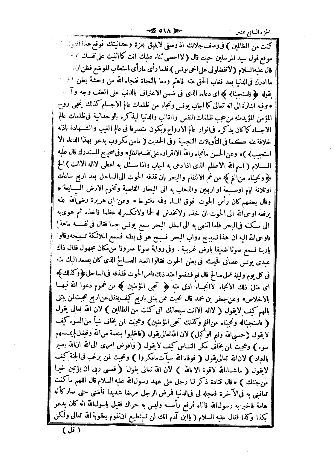 فى وصف جلالك إذ وصفي لا يليق بعزة وحدانيتك فوقع هذا القول منه موقع قول سيد المرسلين حيث قال (لا احصى ثناء عليك أنت كما أثنيت على نفسك) ولذلك قال عليه السلام (لا تفضلونى على أخي يونس) فلما رأى ما رأى استطاب الموضع فظن ان لا يدرك ما أدرك فى الدنيا بعد فغاب الحق عنه فاهتم ودعا بالنجاة فنجاه الله من وحشة بطن الحوت بقوله فَاسْتَجَبْنا لَهُ اى دعاءه الذي فى ضمن الاعتراف بالذنب على الطف وجه وآكده وفيه اشارة الى انه تعالى كما أجاب يونس ونجاه من ظلمات عالم الأجسام كذلك ينجى روح المؤمن المؤيد منه من حجب ظلمات النفس والقالب والدنيا ليذكره بالوحدانية فى ظلمات عالم الأجساد كما كان يذكره فى أنوار عالم الأرواح ويكون متصرفا فى عالم الغيب والشهادة باذنه خلافة عنه كما فى التأويلات النجمية وفى الحديث (ما من مكروب يدعو بهذا الدعاء الا استجيب له) وعن الحسن ما نجاه والله الا إقراره على نفسه بالظلم وفى صحيح المستدرك قال عليه السلام (اسم الله الأعظم الذي إذا دعى به أجاب وإذا سئل به اعطى لا اله الا أنت) إلخ وَنَجَّيْناهُ مِنَ الْغَمِّ من غم الالتقام والبحر بان قذفه الحوت الى الساحل بعد اربع ساعات او ثلاثة ايام او سبعة او أربعين والذهاب به الى البحار القاصية وتخوم الأرض السابعة وقال بعضهم كان رأس الحوت فوق الماء وفمه مفتوحا وعن ابى هريرة رضى الله عنه يرفعه اوحى الله الى الحوت ان خذه ولا تخدش له لحما ولا تكسر له عظما فاخذه ثم هوى به الى مسكنه فى البحر فلما انتهى به الى أسفل البحر سمع يونس حسا فقال فى نفسه ما هذا فاوحى الله اليه ان هذا تسبيح دواب البحر فسبح هو فى بطنه فسمع الملائكة تسبيحه وقالوا يا ربنا نسمع صوتا ضعيفا بأرض غريبة. وفى رواية صوتا معروفا من مكان مجهول فقال ذاك عبدى يونس عصانى فحبسته فى بطن الحوت فقالوا العبد الصالح الذي كان يصعد إليك منه فى كل يوم وليلة عمل صالح قال نعم فشفعوا عند ذلك فامر الحوت فقذفه فى الساحل وَكَذلِكَ اى مثل ذلك الانجاء لا إنجاء ادنى منه نُنْجِي الْمُؤْمِنِينَ من غموم دعوا الله فيها بالإخلاص وعن جعفر بن محمد قال عجبت ممن يتلى بأربع كيف يغفل عن اربع عجبت لمن يبتلى بالهم كيف لا يقول لا إِلهَ إِلَّا أَنْتَ سُبْحانَكَ إِنِّي كُنْتُ مِنَ الظَّالِمِينَ لان الله تعالى يقول فَاسْتَجَبْنا لَهُ وَنَجَّيْناهُ مِنَ الْغَمِّ وَكَذلِكَ نُنْجِي الْمُؤْمِنِينَ وعجبت لمن يخاف شيأ من السوء كيف لا يقول حسبى الله ونعم الوكيل لان الله تعالى يقول فَانْقَلَبُوا بِنِعْمَةٍ مِنَ اللَّهِ وَفَضْلٍ لَمْ يَمْسَسْهُمْ سُوءٌ وعجبت لمن يخاف مكر الناس كيف لا يقول وَأُفَوِّضُ أَمْرِي إِلَى اللَّهِ إِنَّ اللَّهَ بَصِيرٌ بِالْعِبادِ لان الله تعالى يقول فَوَقاهُ اللَّهُ سَيِّئاتِ ما مَكَرُوا وعجبت لمن يرغب فى الجنة كيف لا يقول ما شاءَ اللَّهُ لا قُوَّةَ إِلَّا بِاللَّهِ) لان الله تعالى يقول فَعَسى رَبِّي أَنْ يُؤْتِيَنِ خَيْراً مِنْ جَنَّتِكَ قال قتادة ذكر لنا رجل على عهد رسول الله عليه السلام قال اللهم ما كنت تعاقبنى به فى الآخرة فعجله لى فى الدنيا فمرض الرجل مرضا شديدا فأضنى حتى صار كأنه هامة فاخبر به رسول الله فاتاه فرفع رأسه وليس به حراك فقيل يا رسول الله انه كان يدعو بكذا وكذا فقال عليه السلام (يا ابن آدم انك لن تستطيع ان تقوم بعقوبة الله تعالى ولكن