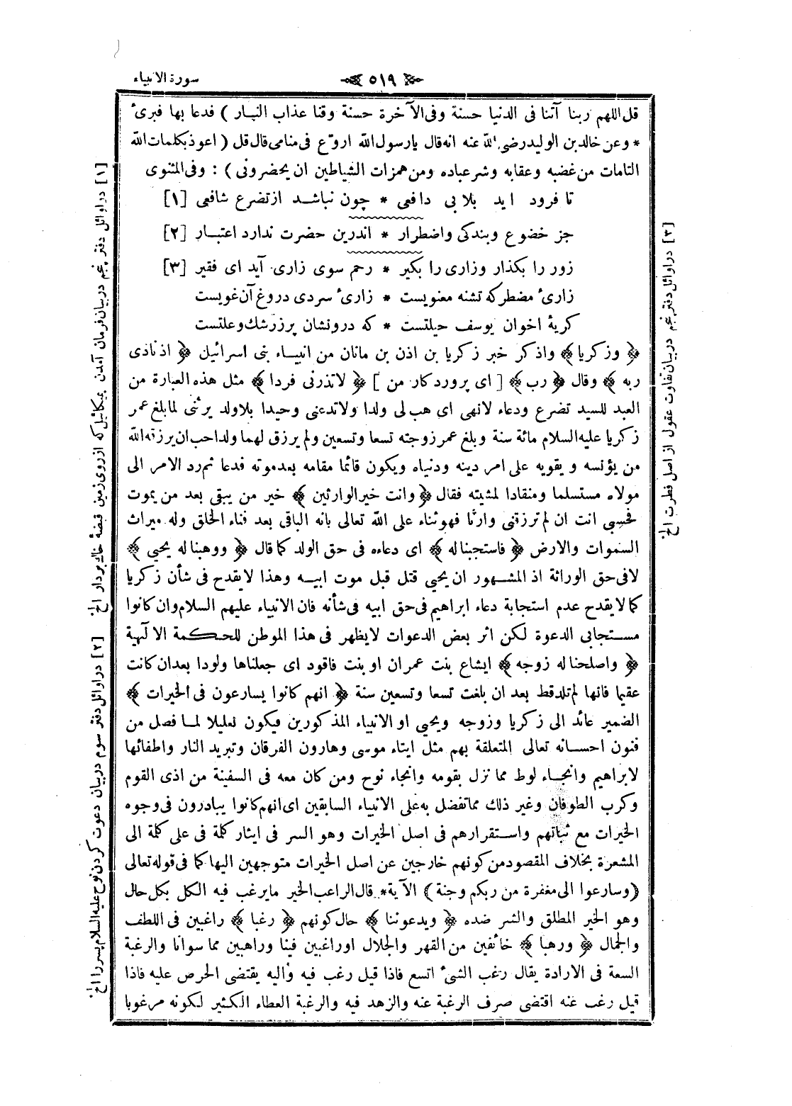 وَزَكَرِيَّا واذكر خبر زكريا بن اذن بن مانان من أنبياء بنى إسرائيل إِذْ نادى رَبَّهُ وقال رَبِّ [اى پروردگار من] لا تَذَرْنِي فَرْداً مثل هذه العبارة من العبد للسيد تضرع ودعاء لا نهى اى هب لى ولدا ولا تدعنى وحيدا بلا ولد يرثنى لما بلغ عمر زكريا عليه السلام مائة سنة وبلغ عمر زوجته تسعا وتسعين ولم يرزق لهما ولد أحب ان يرزقه الله من يؤنسه ويقويه على امر دينه ودنياه ويكون قائما مقامه بعد موته فدعا ثم رد الأمر الى مولاه مستسلما ومنقادا لمشيته فقال وَأَنْتَ خَيْرُ الْوارِثِينَ خير من يبقى بعد من يموت فحسبى أنت ان لم ترزقنى وأرنا فهو ثناء على الله تعالى بانه الباقي بعد فناء الخلق وله ميراث السموات والأرض فَاسْتَجَبْنا لَهُ اى دعاءه فى حق الولد كما قال وَوَهَبْنا لَهُ يَحْيى لا فى حق الوراثة إذ المشهور ان يحيى قتل قبل موت أبيه وهذا لا يقدح فى شأن زكريا كما لا يقدح عدم استجابة دعاء ابراهيم فى حق أبيه فى شأنه فان الأنبياء عليهم السلام وان كانوا مستجابى الدعوة لكن اثر بعض الدعوات لا يظهر فى هذا الموطن للحكمة الالهية وَأَصْلَحْنا لَهُ زَوْجَهُ ايشاع بنت عمران او بنت فاقود اى جعلناها ولودا بعد ان كانت عقيما فانها لم تلد قط بعد ان بلغت تسعا وتسعين سنة إِنَّهُمْ كانُوا يُسارِعُونَ فِي الْخَيْراتِ الضمير عائد الى زكريا وزوجه ويحيى او الأنبياء المذكورين فيكون تعليلا لما فصل من فنون إحسانه تعالى المتعلقة بهم مثل إيتاء موسى وهارون الفرقان وتبريد النار وإطفائها لابراهيم وإنجاء لوط مما نزل بقومه وإنجاء نوح ومن كان معه فى السفينة من أذى القوم وكرب الطوفان وغير ذلك مما تفضل به على الأنبياء السابقين اى انهم كانوا يبادرون فى وجوه الخيرات مع ثباتهم واستقرارهم فى اصل الخيرات وهو السر فى إيثار كلمة فى على كلمة الى المشعرة بخلاف المقصود من كونهم خارجين عن اصل الخيرات متوجهين إليها كما فى قوله تعالى وَسارِعُوا إِلى مَغْفِرَةٍ مِنْ رَبِّكُمْ وَجَنَّةٍ الآية قال الراغب الخير ما يرغب فيه الكل بكل حال وهو الخير المطلق والشر ضده وَيَدْعُونَنا حال كونهم رَغَباً راغبين فى اللطف والجمال وَرَهَباً خائفين من القهر والجلال او راغبين فينا وراهبين مما سوانا والرغبة السعة فى الارادة يقال رغب الشيء اتسع فاذا قيل رغب فيه واليه يقتضى الحرص عليه فاذا قيل رغب عنه اقتضى صرف الرغبة عنه والزهد فيه والرغبة العطاء الكثير لكونه مرغوبا
