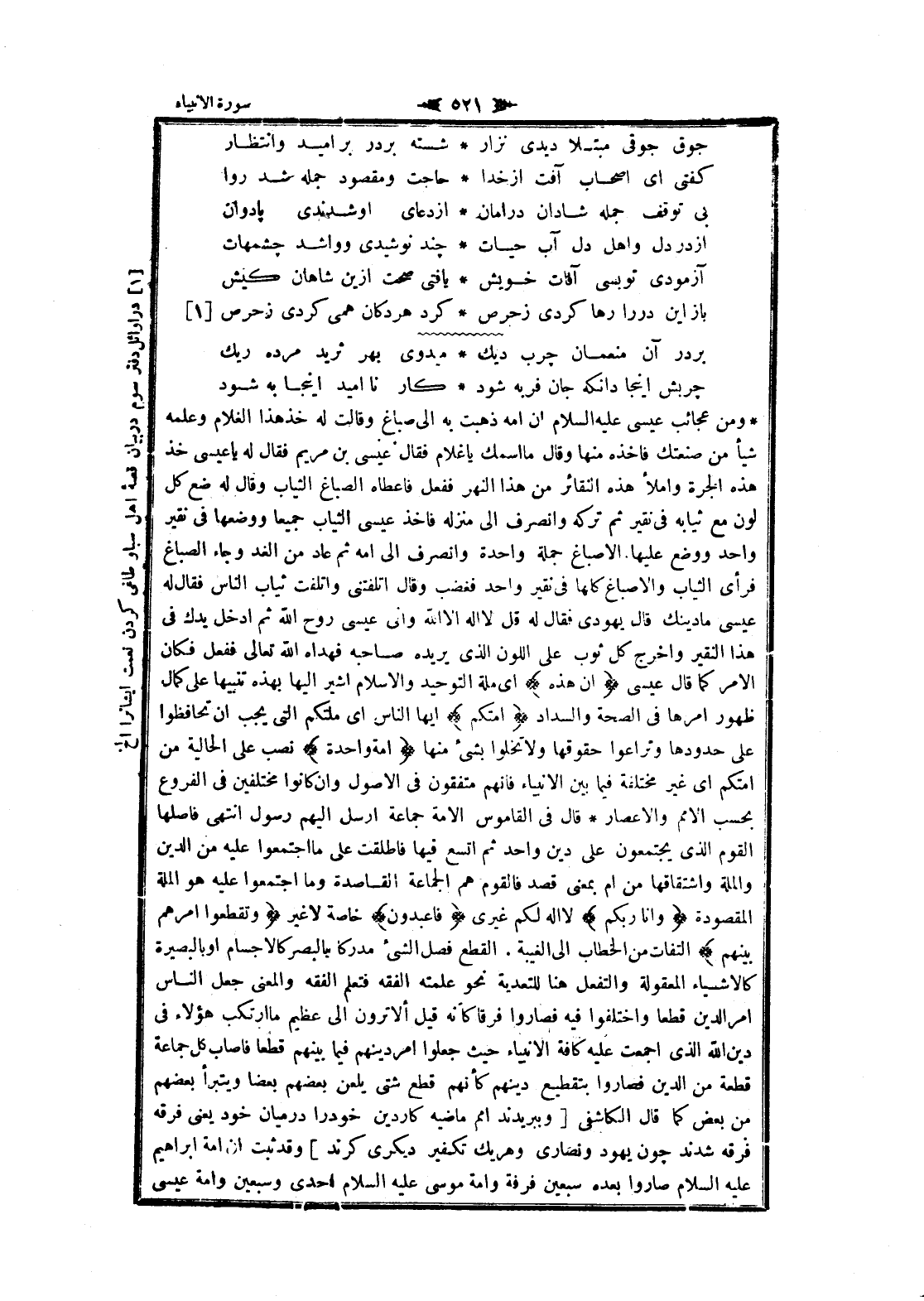 ومن عجائب عيسى عليه السلام ان امه ذهبت به الى صباغ وقالت له خذ هذا الغلام وعلمه شيأ من صنعتك فاخذه منها وقال ما اسمك يا غلام فقال عيسى بن مريم فقال له يا عيسى خذ هذه الجرة واملأ هذه النقائر من هذا النهر ففعل فاعطاه الصباغ الثياب وقال له ضع كل لون مع ثيابه فى نقير ثم تركه وانصرف الى منزله فاخذ عيسى الثياب جميعا ووضعها فى نقير واحد ووضع عليها الاصباغ جملة واحدة وانصرف الى امه ثم عاد من الغد وجاء الصباغ فرأى الثياب والاصباغ كلها فى نقير واحد فغضب وقال اتلفتنى واتلفت ثياب الناس فقال له عيسى ما دينك قال يهودى فقال له قل لا اله الا الله وانى عيسى روح الله ثم ادخل يدك فى هذا النقير واخرج كل ثوب على اللون الذي يريده صاحبه فهداه الله تعالى ففعل فكان الأمر كما قال عيسى إِنَّ هذِهِ اى ملة التوحيد والإسلام أشير إليها بهذه تنبيها على كمال ظهور أمرها فى الصحة والسداد أُمَّتُكُمْ ايها الناس اى ملتكم التي يجب ان تحافظوا على حدودها وتراعوا حقوقها ولا تخلوا بشئ منها أُمَّةً واحِدَةً نصب على الحالية من أمتكم اى غير مختلفة فيما بين الأنبياء فانهم متفقون فى الأصول وان كانوا مختلفين فى الفروع بحسب الأمم والاعصار قال فى القاموس الامة جماعة أرسل إليهم رسول انتهى فاصلها القوم الذي يجتمعون على دين واحد ثم اتسع فيها فاطلقت على ما اجتمعوا عليه من الدين والملة واشتقاقها من أم بمعنى قصد فالقوم هم الجماعة القاصدة وما اجتمعوا عليه هو الملة المقصودة وَأَنَا رَبُّكُمْ لا اله لكم غيرى فَاعْبُدُونِ خاصة لا غير وَتَقَطَّعُوا أَمْرَهُمْ بَيْنَهُمْ التفات من الخطاب الى الغيبة. القطع فصل الشيء مدركا بالبصر كالاجسام او بالبصيرة كالاشياء المعقولة والتفعل هنا للتعدية نحو علمته الفقه فتعلم الفقه والمعنى جعل الناس امر الدين قطعا واختلفوا فيه فصاروا فرقا كأنه قيل ألا ترون الى عظيم ما ارتكب هؤلاء فى دين الله الذي أجمعت عليه كافة الأنبياء حيث جعلوا امر دينهم فيما بينهم قطعا فاصاب كل جماعة قطعة من الدين فصاروا بتقطيع دينهم كأنهم قطع شتى يلعن بعضهم بعضا ويتبرأ بعضهم من بعض كما قال الكاشفى [وببريدند امم ماضيه كار دين خود را در ميان خود يعنى فرقه فرقه شدند چون يهود ونصارى وهر يك تكفير ديكرى كرند] وقد ثبت ان امة ابراهيم عليه السلام صاروا بعده سبعين فرقة وامة موسى عليه السلام احدى وسبعين وامة عيسى