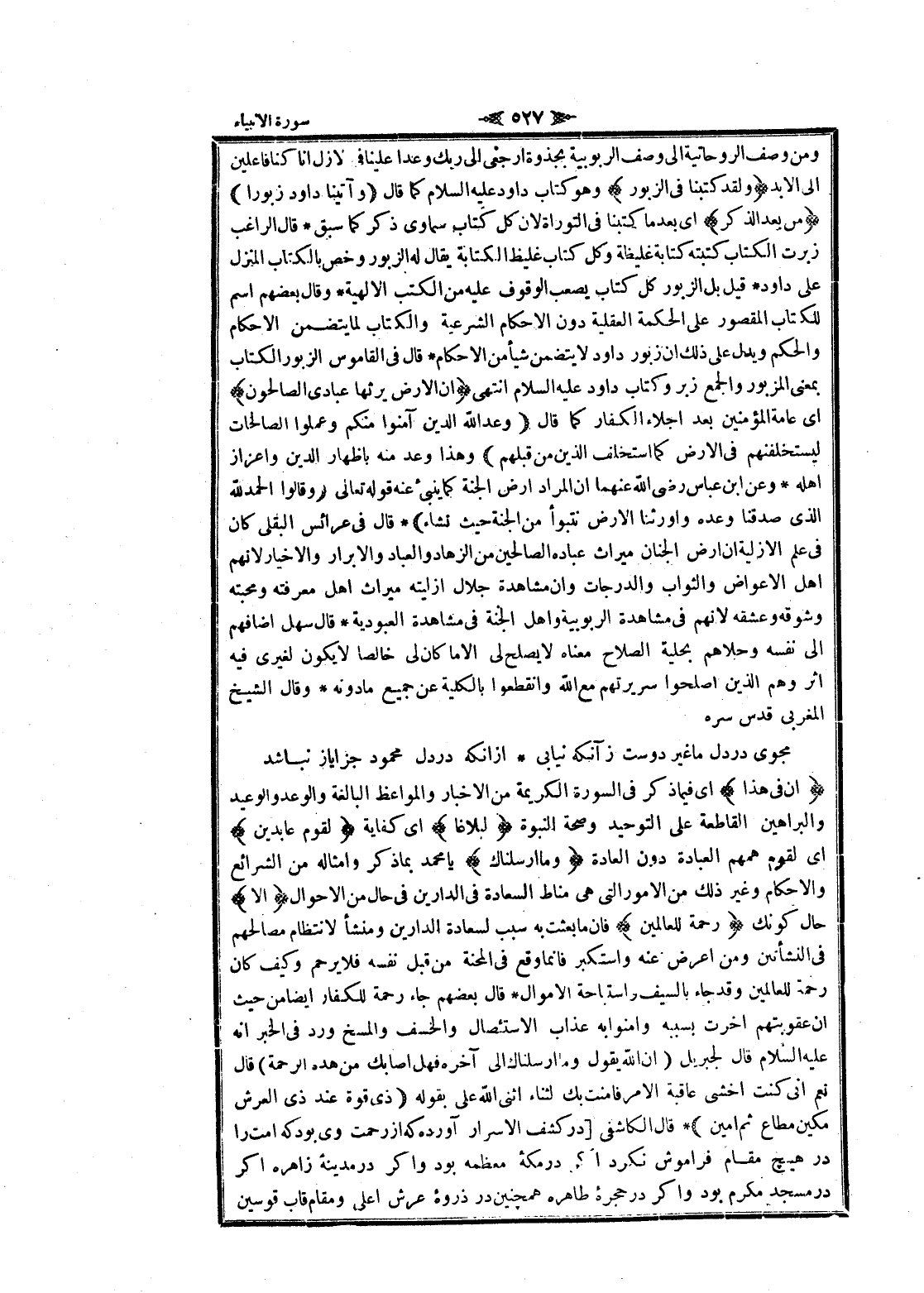 ومن وصف الروحانية الى وصف الربوبية بجذوة ارجعي الى ربك وعدا علينا فى الأزل انا كنا فاعلين الى الابد وَلَقَدْ كَتَبْنا فِي الزَّبُورِ وهو كتاب داود عليه السلام كما قال وَآتَيْنا داوُدَ زَبُوراً مِنْ بَعْدِ الذِّكْرِ اى بعد ما كتبنا فى التوراة لان كل كتاب سماوى ذكر كما سبق قال الراغب زبرت الكتاب كتبته كتابة غليظة وكل كتاب غليظ الكتابة يقال له الزبور وخص بالكتاب المنزل على داود قيل بل الزبور كل كتاب يصعب الوقوف عليه من الكتب الالهية وقال بعضهم اسم للكتاب المقصور على الحكمة العقلية دون الاحكام الشرعية والكتاب لما يتضمن الاحكام والحكم ويدل على ذلك ان زبور داود لا يتضمن شيأ من الاحكام قال فى القاموس الزبور الكتاب بمعنى المزبور والجمع زبر وكتاب داود عليه السلام انتهى أَنَّ الْأَرْضَ يَرِثُها عِبادِيَ الصَّالِحُونَ اى عامة المؤمنين بعد اجلاء الكفار كما قال وَعَدَ اللَّهُ الَّذِينَ آمَنُوا مِنْكُمْ وَعَمِلُوا الصَّالِحاتِ لَيَسْتَخْلِفَنَّهُمْ فِي الْأَرْضِ كَمَا اسْتَخْلَفَ الَّذِينَ مِنْ قَبْلِهِمْ وهذا وعد منه بإظهار الدين وإعزاز اهله وعن ابن عباس رضى الله عنهما ان المراد ارض الجنة كما ينبئ عنه قوله تعالى وَقالُوا الْحَمْدُ لِلَّهِ الَّذِي صَدَقَنا وَعْدَهُ وَأَوْرَثَنَا الْأَرْضَ نَتَبَوَّأُ مِنَ الْجَنَّةِ حَيْثُ نَشاءُ قال فى عرائس البقلى كان فى علم الازلية ان ارض الجنان ميراث عباده الصالحين من الزهاد والعباد والأبرار والأخيار لانهم اهل الأعواض والثواب والدرجات وان مشاهدة جلال أزليته ميراث اهل معرفته ومحبته وشوقه وعشقه لانهم فى مشاهدة الربوبية واهل الجنة فى مشاهدة العبودية قال سهل أضافهم الى نفسه وحلاهم بحلية الصلاح معناه لا يصلح لى إلا ما كان لى خالصا لا يكون لغيرى فيه اثر وهم الذين أصلحوا سريرتهم مع الله وانقطعوا بالكلية عن جميع مادونه وقال الشيخ المغربي قدس سره