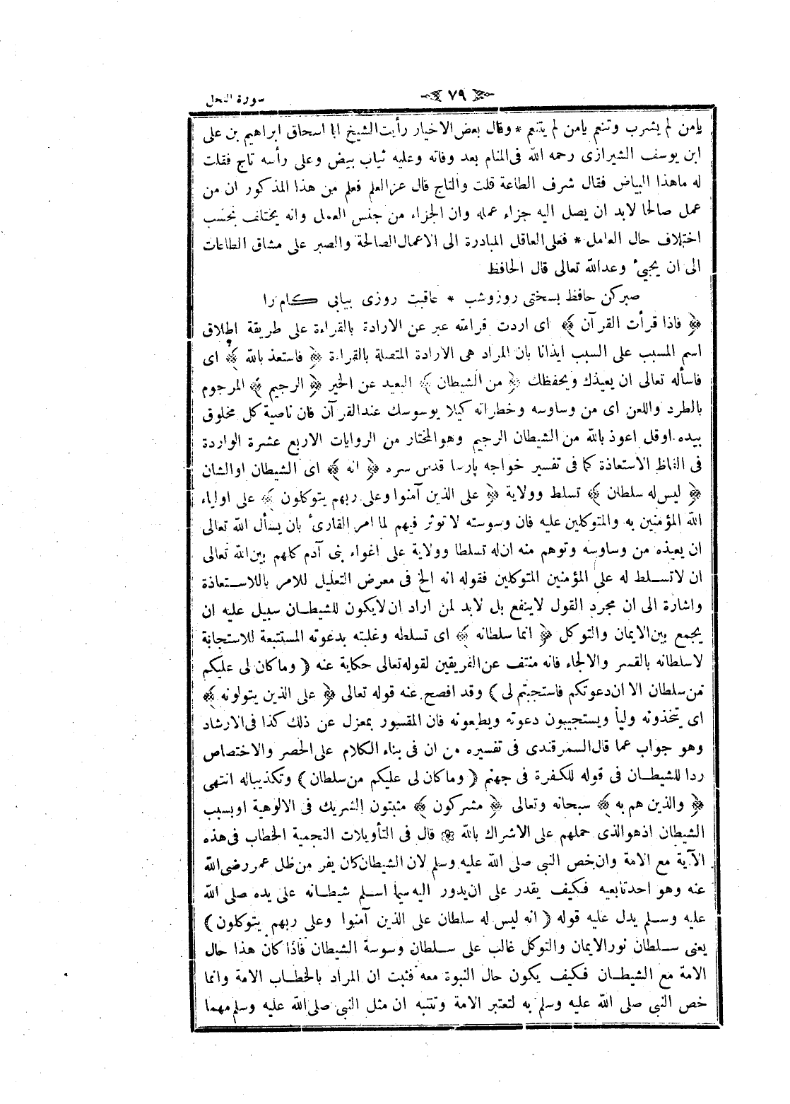 فَإِذا قَرَأْتَ الْقُرْآنَ اى أردت قراءته عبر عن الارادة بالقراءة على طريقة اطلاق اسم المسبب على السبب إيذانا بان المراد هى الارادة المتصلة بالقراءة فَاسْتَعِذْ بِاللَّهِ اى فاسأله تعالى ان يعيذك ويحفظك مِنَ الشَّيْطانِ البعيد عن الخير الرَّجِيمِ المرجوم بالطرد واللعن اى من وساوسه وخطراته كيلا يوسوسك عند القرآن فان ناصية كل مخلوق بيده او قل أعوذ بالله من الشيطان الرجيم وهو المختار من الروايات الأربع عشرة الواردة فى ألفاظ الاستعاذة كما فى تفسير خواجه پارسا قدس سره إِنَّهُ اى الشيطان او الشان لَيْسَ لَهُ سُلْطانٌ تسلط وولاية عَلَى الَّذِينَ آمَنُوا وَعَلى رَبِّهِمْ يَتَوَكَّلُونَ على اولياء الله المؤمنين به والمتوكلين عليه فان وسوسته لا توثر فيهم لما امر القارئ بان يسأل الله تعالى ان يعيذه من وساوسه وتوهم منه ان له تسلطا وولاية على إغواء بنى آدم كلهم بين الله تعالى ان لا تسلط له على المؤمنين المتوكلين فقوله انه إلخ فى معرض التعليل للامر باللاستعاذة واشارة الى ان مجرد القول لا ينفع بل لا بد لمن أراد ان لا يكون للشيطان سبيل عليه ان يجمع بين الايمان والتوكل إِنَّما سُلْطانُهُ اى تسلطه وغلبته بدعوته المستتبعة للاستجابة لا سلطانه بالقسر والإلجاء فانه منتف عن الفريقين لقوله تعالى حكاية عنه وَما كانَ لِي عَلَيْكُمْ مِنْ سُلْطانٍ إِلَّا أَنْ دَعَوْتُكُمْ فَاسْتَجَبْتُمْ لِي وقد افصح عنه قوله تعالى عَلَى الَّذِينَ يَتَوَلَّوْنَهُ اى يتخذونه وليا ويستجيبون دعوته ويطيعونه فان المقسور بمعزل عن ذلك كذا فى الإرشاد وهو جواب عما قال السمرقندي فى تفسيره من ان فى بناء الكلام على الحصر والاختصاص ردا للشيطان فى قوله للكفرة فى جهنم وَما كانَ لِي عَلَيْكُمْ مِنْ سُلْطانٍ وتكذيباله انتهى وَالَّذِينَ هُمْ بِهِ سبحانه وتعالى مُشْرِكُونَ مثبتون الشريك فى الالوهية او بسبب الشيطان إذ هو الذي حملهم على الإشراك بالله قال فى التأويلات النجمية الخطاب فى هذه الآية مع الامة وان خص النبي صلى الله عليه وسلم لان الشيطان كان يفر من ظل عمر رضى الله عنه وهو أحد تابعيه فكيف يقدر على ان يدور اليه سيما اسلم شيطانه على يده صلى الله عليه وسلم يدل عليه قوله (انه ليس له سلطان على الذين آمنوا وعلى ربهم يتوكلون) يعنى سلطان نور الايمان والتوكل غالب على سلطان وسوسة الشيطان فاذا كان هذا حال الامة مع الشيطان فكيف يكون حال النبوة معه فثبت ان المراد بالخطاب الامة وانما خص النبي صلى الله عليه وسلم به لتعتبر الامة وتتنبه ان مثل النبي صلى الله عليه وسلم مهما