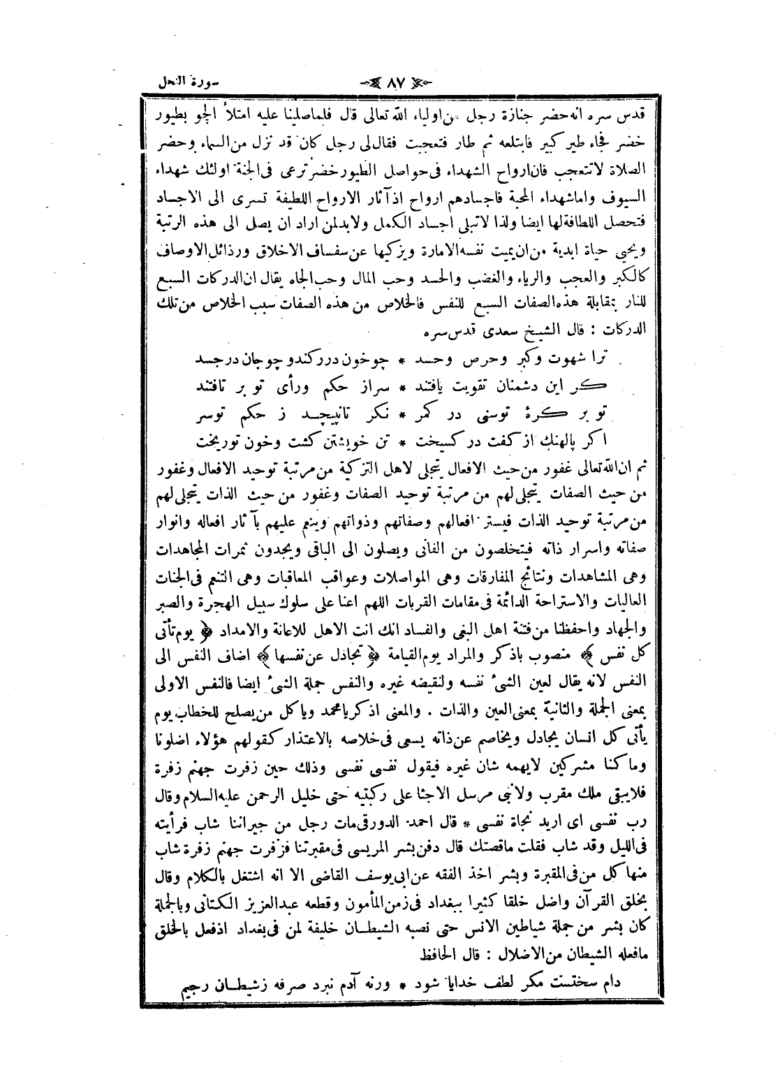 قدس سره انه حضر جنازة رجل من اولياء الله تعالى قال فلما صلينا عليه امتلأ الجو بطيور خضر فجاء طير كبير فابتلعه ثم طار فتعجبت فقال لى رجل كان قد نزل من السماء وحضر الصلاة لا تتعجب فان أرواح الشهداء فى حواصل الطيور خضر ترعى فى الجنة أولئك شهداء السيوف واما شهداء المحبة فاجسادهم أرواح إذ آثار الأرواح اللطيفة تسرى الى الأجساد فتحصل اللطافة لها ايضا ولذا لا تبلى أجساد الكمل ولا بد لمن أراد ان يصل الى هذه الرتبة ويحيى حياة ابدية من ان يميت نفسه الامارة ويزكيها عن سفساف الأخلاق ورذائل الأوصاف كالكبر والعجب والرياء والغضب والحسد وحب المال وحب الجاه يقال ان الدركات السبع للنار بمقابلة هذه الصفات السبع للنفس فالخلاص من هذه الصفات سبب الخلاص من تلك الدركات: قال الشيخ سعدى قدس سره