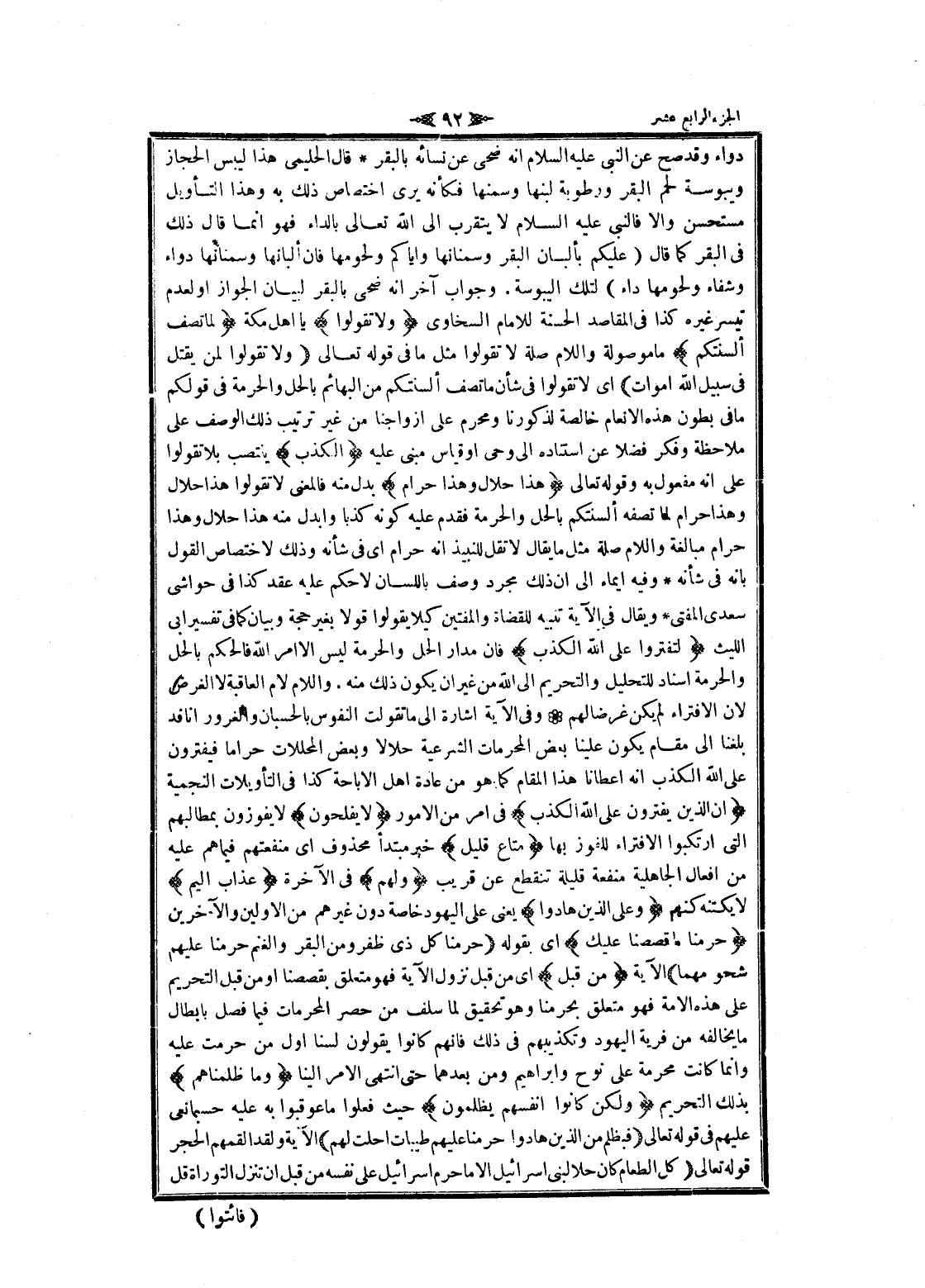 دواء وقد صح عن النبي عليه السلام انه ضحى عن نسائه بالبقر قال الحليمي هذا ليبس الحجاز ويبوسة لحم البقر ورطوبة لبنها وسمنها فكأنه يرى اختصاص ذلك به وهذا التأويل مستحسن والا فالنبى عليه السلام لا يتقرب الى الله تعالى بالداء فهو انما قال ذلك فى البقر كما قال (عليكم بألبان البقر وسمانها وإياكم ولحومها فان ألبانها وسمانها دواء وشفاء ولحومها داء) لتلك اليبوسة. وجواب آخر انه ضحى بالبقر لبيان الجواز او لعدم تيسر غيره كذا فى المقاصد الحسنة للامام السخاوي وَلا تَقُولُوا يا أهل مكة لِما تَصِفُ أَلْسِنَتُكُمُ ما موصولة واللام صلة لا تقولوا مثل ما فى قوله تعالى وَلا تَقُولُوا لِمَنْ يُقْتَلُ فِي سَبِيلِ اللَّهِ أَمْواتٌ اى لا تقولوا فى شأن ما تصف ألسنتكم من البهائم بالحل والحرمة فى قولكم ما فى بطون هذه الانعام خالصة لذكورنا ومحرم على أزواجنا من غير ترتيب ذلك الوصف على ملاحظة وفكر فضلا عن استناده الى وحي او قياس مبنى عليه الْكَذِبَ ينتصب بلا تقولوا على انه مفعول به وقوله تعالى هذا حَلالٌ وَهذا حَرامٌ بدل منه فالمعنى لا تقولوا هذا حلال وهذا حرام لما تصفه ألسنتكم بالحل والحرمة فقدم عليه كونه كذبا وأبدل منه هذا حلال وهذا حرام مبالغة واللام صلة مثل ما يقال لا تقل للنبيذ انه حرام اى فى شأنه وذلك لاختصاص القول بانه فى شأنه وفيه ايماء الى ان ذلك مجرد وصف باللسان لا حكم عليه عقد كذا فى حواشى سعدى المفتى ويقال فى الآية تنبيه للقضاة والمفتين كيلا يقولوا قولا بغير حجة وبيان كما فى تفسير ابى الليث لِتَفْتَرُوا عَلَى اللَّهِ الْكَذِبَ فان مدار الحل والحرمة ليس الا امر الله فالحكم بالحل والحرمة اسناد للتحليل والتحريم الى الله من غير ان يكون ذلك منه. واللام لام العاقبة لا الغرض لان الافتراء لم يكن غرضا لهم وفى الآية اشارة الى ما تقولت النفوس بالحسبان والغرور انا قد بلغنا الى مقام يكون علينا بعض المحرمات الشرعية حلالا وبعض المحللات حراما فيفترون على الله الكذب انه أعطانا هذا المقام كما هو من عادة اهل الإباحة كذا فى التأويلات النجمية إِنَّ الَّذِينَ يَفْتَرُونَ عَلَى اللَّهِ الْكَذِبَ فى امر من الأمور لا يُفْلِحُونَ لا يفوزون بمطالبهم التي ارتكبوا الافتراء للفوز بها مَتاعٌ قَلِيلٌ خبر مبتدأ محذوف اى منفعتهم فيما هم عليه من افعال الجاهلية منفعة قليلة تنقطع عن قريب وَلَهُمْ فى الآخرة عَذابٌ أَلِيمٌ لا يكتنه كنههم وَعَلَى الَّذِينَ هادُوا يعنى على اليهود خاصة دون غيرهم من الأولين والآخرين حَرَّمْنا ما قَصَصْنا عَلَيْكَ اى بقوله حَرَّمْنا كُلَّ ذِي ظُفُرٍ وَمِنَ الْبَقَرِ وَالْغَنَمِ حَرَّمْنا عَلَيْهِمْ شُحُومَهُما الآية مِنْ قَبْلُ اى من قبل نزول الآية فهو متعلق بقصصنا او من قبل التحريم على هذه الامة فهو متعلق بحرمنا وهو تحقيق لما سلف من حصر المحرمات فيما فصل بابطال ما يخالفه من قرية اليهود وتكذيبهم فى ذلك فانهم كانوا يقولون لسنا أول من حرمت عليه وانما كانت محرمة على نوح وابراهيم ومن بعدهما حتى انتهى الأمر إلينا وَما ظَلَمْناهُمْ بذلك التحريم وَلكِنْ كانُوا أَنْفُسَهُمْ يَظْلِمُونَ حيث فعلوا ما عوقبوا به عليه حسبما نعى عليهم فى قوله تعالى فَبِظُلْمٍ مِنَ الَّذِينَ هادُوا حَرَّمْنا عَلَيْهِمْ طَيِّباتٍ أُحِلَّتْ لَهُمْ الآية ولقد القمهم الحجر قوله تعالى كُلُّ الطَّعامِ كانَ حِلًّا لِبَنِي إِسْرائِيلَ إِلَّا ما حَرَّمَ إِسْرائِيلُ عَلى نَفْسِهِ مِنْ قَبْلِ أَنْ تُنَزَّلَ التَّوْراةُ قُلْ