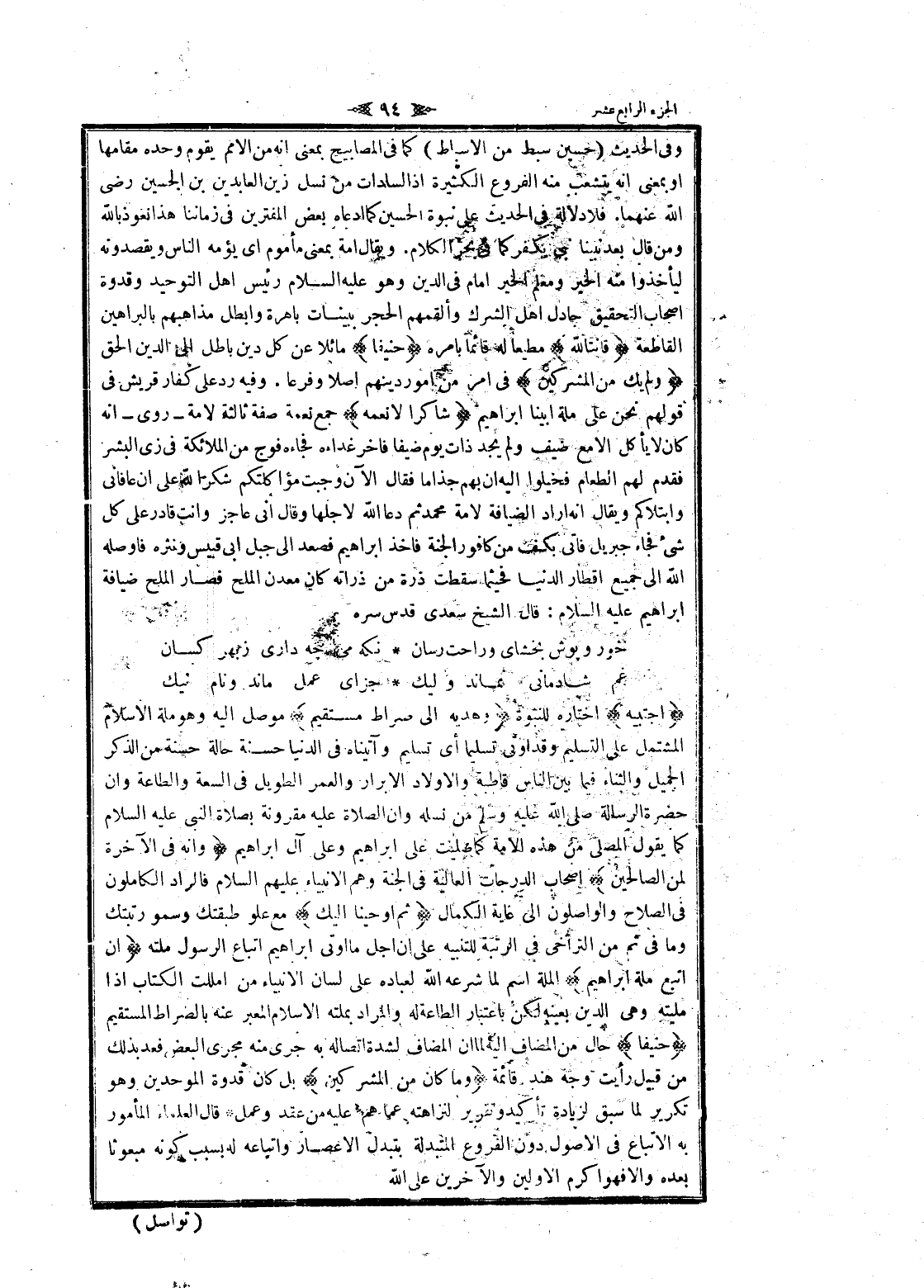 وفى الحديث (حسين سبط من الأسباط) كما فى المصابيح بمعنى انه من الأمم يقوم وحده مقامها او بمعنى انه يتشعب منه الفروع الكثيرة إذا السادات من نسل زين العابدين بن الحسين رضى الله عنهما. فلا دلالة فى الحديث على نبوة الحسين كما ادعاه بعض المفترين فى زماننا هذا نعوذ بالله ومن قال بعد نبينا نبى يكفر كما فى بحر الكلام. ويقال امة بمعنى مأموم اى يؤمه الناس ويقصدونه ليأخذوا منه الخير ومعلم الخير امام فى الدين وهو عليه السلام رئيس اهل التوحيد وقدوة اصحاب التحقيق جادل اهل الشرك وألقمهم الحجر ببينات باهرة وأبطل مذاهبهم بالبراهين القاطعة قانِتاً لِلَّهِ مطيعا له قائما بامره حَنِيفاً مائلا عن كل دين باطل الى الدين الحق وَلَمْ يَكُ مِنَ الْمُشْرِكِينَ فى امر من امور دينهم أصلا وفرعا. وفيه رد على كفار قريش فى قولهم نحن على ملة أبينا ابراهيم شاكِراً لِأَنْعُمِهِ جمع نعمة صفة ثالثة لامة- روى- انه كان لا يأكل الا مع ضيف ولم يجد ذات يوم ضيفا فاخر غداءه فجاءه فوج من الملائكة فى زى البشر فقدم لهم الطعام فخيلوا اليه ان بهم جذاما فقال الآن وجبت مؤاكلتكم شكرا لله على ان عافانى وابتلاكم ويقال انه أراد الضيافة لامة محمد ثم دعا الله لاجلها وقال انى عاجز وأنت قادر على كل شىء فجاء جبريل فاتى بكف من كافور الجنة فاخذ ابراهيم فصعد الى جبل ابى قبيس ونثره فاوصله الله الى جميع أقطار الدنيا فحيثما سقطت ذرة من ذراته كان معدن الملح فصار الملح ضيافة ابراهيم عليه السلام: قال الشيخ سعدى قدس سره