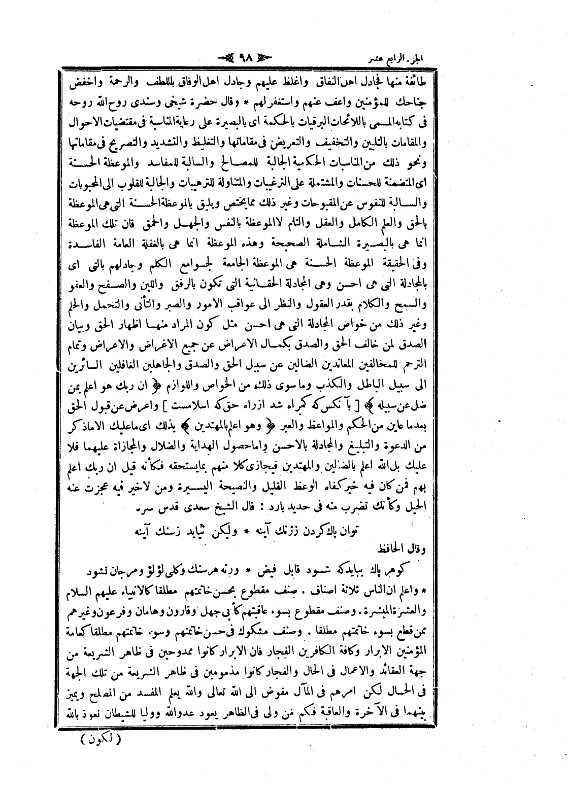 طائفة منها فجادل اهل النفاق واغلظ عليهم وجادل اهل الوفاق باللطف والرحمة واخفض جناحك للمؤمنين واعف عنهم واستغفر لهم وقال حضرة شيخى وسندى روح الله روحه فى كتابه المسمى باللائحات البرقيات بالحكمة اى بالبصيرة على رعاية المناسبة فى مقتضيات الأحوال والمقامات بالتليين والتخفيف والتعريض فى مقاماتها والتغليظ والتشديد والتصريح فى مقاماتها ونحو ذلك من المناسبات الحكمية الجالبة للمصالح والسالبة للمفاسد والموعظة الحسنة اى المتضمنة للحسنات والمشتملة على الترغيبات والمتناولة للترهيبات والجالبة للقلوب الى الحبوبات والسالبة للنفوس عن المقبوحات وغير ذلك مما يختص ويليق بالموعظة الحسنة التي هى الموعظة بالحق والعلم الكامل والعقل والتام لا الموعظة بالنفس والجهل والحمق قان تلك الموعظة انما هى بالبصيرة الشاملة الصحيحة وهذه الموعظة انما هى بالغفلة العامة الفاسدة وفى الحقيقة الموعظة الحسنة هى الموعظة الجامعة لجوامع الكلم وجادلهم بالتي اى بالمجادلة التي هى احسن وهى المجادلة الحقانية التي تكون بالرفق واللين والصفح والعفو والسمح والكلام بقدر العقول والنظر الى عواقب الأمور والصبر والتأنى والتحمل والحلم وغير ذلك من خواص المجادلة التي هى احسن مثل كون المراد منها اظهار الحق وبيان الصدق لمن خالف الحق والصدق بكمال الاعراض عن جميع الأغراض والاعراض وتمام الترحم للمخالفين المعاندين الضالين عن سبيل الحق والصدق والجاهلين الغافلين السائرين الى سبيل الباطل والكذب وما سوى ذلك من الخواص واللوازم إِنَّ رَبَّكَ هُوَ أَعْلَمُ بِمَنْ ضَلَّ عَنْ سَبِيلِهِ [بآنكس كه كمراه شد از راه حق كه اسلامست] واعرض عن قبول الحق بعد ما عاين من الحكم والمواعظ والعبر وَهُوَ أَعْلَمُ بِالْمُهْتَدِينَ بذلك اى ما عليك الا ما ذكر من الدعوة والتبليغ والمجادلة بالأحسن واما حصول الهداية والضلال والمجازاة عليهما فلا عليك بل الله اعلم بالضالين والمهتدين فيجازى كلا منهم بما يستحقه فكأنه قيل ان ربك اعلم بهم فمن كان فيه خير كفاه الوعظ القليل والنصيحة اليسيرة ومن لا خير فيه عجزت عنه الحيل وكأنك تضرب منه فى حديد بارد: قال الشيخ سعدى قدس سره