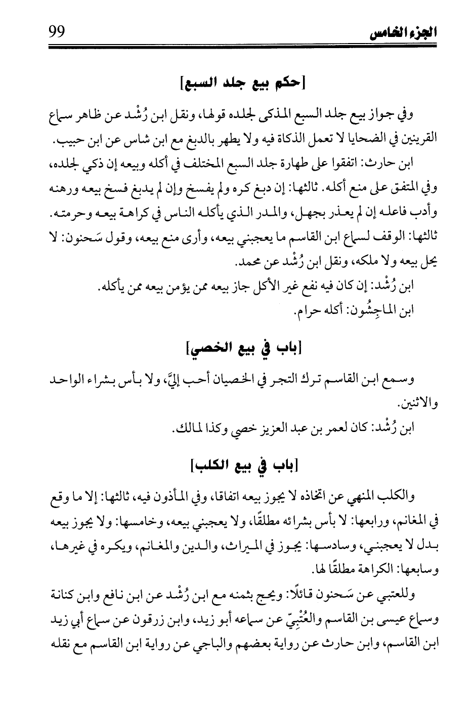 ابن رُشْد: أول كلامه خلاف آخره لم يجزه أوله، وهو قول ابن القاسم في العشرة، وأجازه في آخر كلامه، وهو دليل قولها: يجوز بيع السباع لتذكى لجلودها.