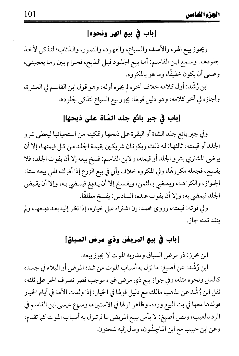ابن رُشْد: زيادة ابن حبيب عن أصبغ، ومطرف، وابن القاسم: إلا أن تكون بينة الشراء إنما شهدت به وهو مغصوب لم يرد، فيكون مفسوخًا تفسير لهذا السماع؛ لأن شراءها قبل ردها ردًا صحيحًا، وانقطاع خوفه عنه فيها لكونه على حالة من الظلم، والقدرة على الامتناع من جريان الحق عليه فاسد؛ لأنه مغلوب على بيعها منه، وإن