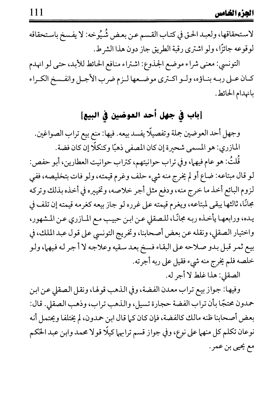 ابن رُشْد: يريد في تبنه بعد درسه، وأما قبل درسه فجائز؛ لأنه يحرز ويرى سنبله ويعرف قدره، وقيل لا يجوز، وقاله التونسي وحمل غيره هذا السماع عليه، والصواب، الأول، وهو نقل الجلاب عن المذهب، وفي جعلها: لا بأس ببيع زرع استحصد كل قفيز بكذا بثمن نقدًا ومؤجلًا، ولو تأخر درسه لخمسة عشر يومًا؛ لأنه معلوم بالكيل، ويصل لمعرفة القمح بفرك سنبله، ولا بأس ببيع زيت زيتون قبل عصره كل رطل بكذا، وفي بيوعها الفاسدة إن كان خروجه بعد عصره معروفًا، جاز كالزرع، وإلا لم يجز إلا أن يكون مخيرًا فيه، ولا بنقده، ويكون عصره لعشرة أيام ونحوها.