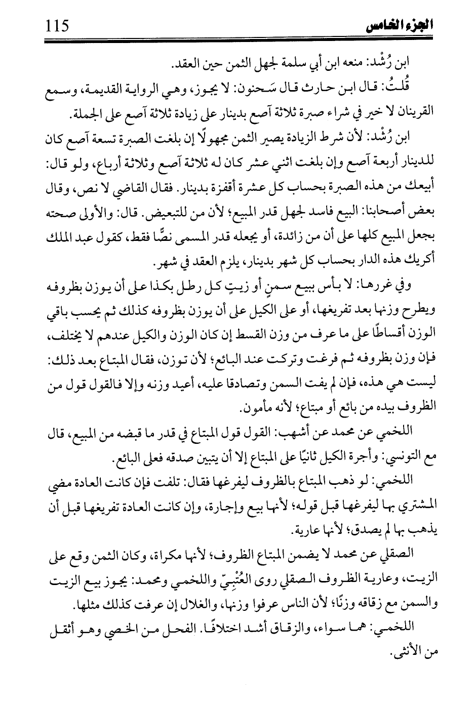 ابن رُشْد: هذه تجري على الخلاف في جمع الرجلين سلعتيهما في البيع؛ لأنهما دخلا على أن يأخذ كل منهما نصف الأرض الذي يليه بما يصيبه من ثمنها ولا يعلم ذلك إلا بعد التقويم لاختلاف الأرض، ولو كانت مستوية جاز؛ لأن كل نصف منهما بنصف الثمن، وقول ابن الحاجب عقب ذكره القولين في مسألة جمع السلعتين في البيع بخلاف سلعة وخمر على الأصح، وعلى الصحة يقسط فيهما إن أراد به مع جهل حرمة المحرم لم