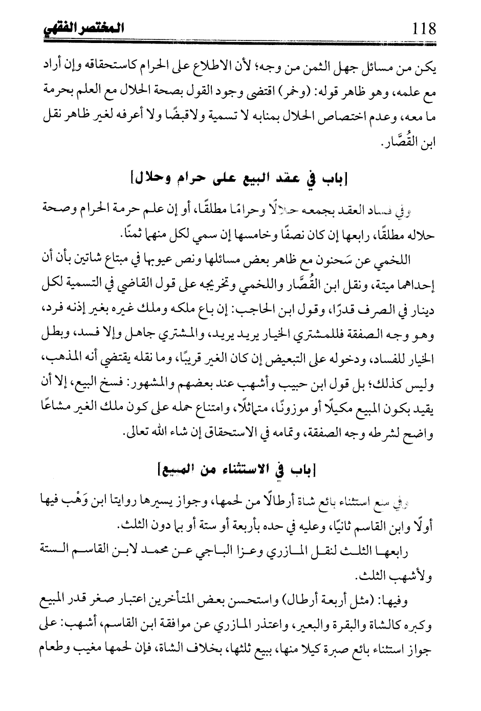 ابن عبد السلام: لا أعرفه إلا قول الكافي: أجازت طائفة استثناء ما شاء من أجزاء الشاة والبعير والبقرة، وسواقطها ولو في الحضر، وطائفة لم تجز شيئًا من ذلك، ولو في السفر وكل ذلك روي عن مالك. وعلى الجواز في جبره على الذبح نقل أبي حفص عن المذهب وظاهر نقل ابن رُشْد رواية أبي قرة، وهو نص رواية ابن وَهْب فيها في بعير برى.