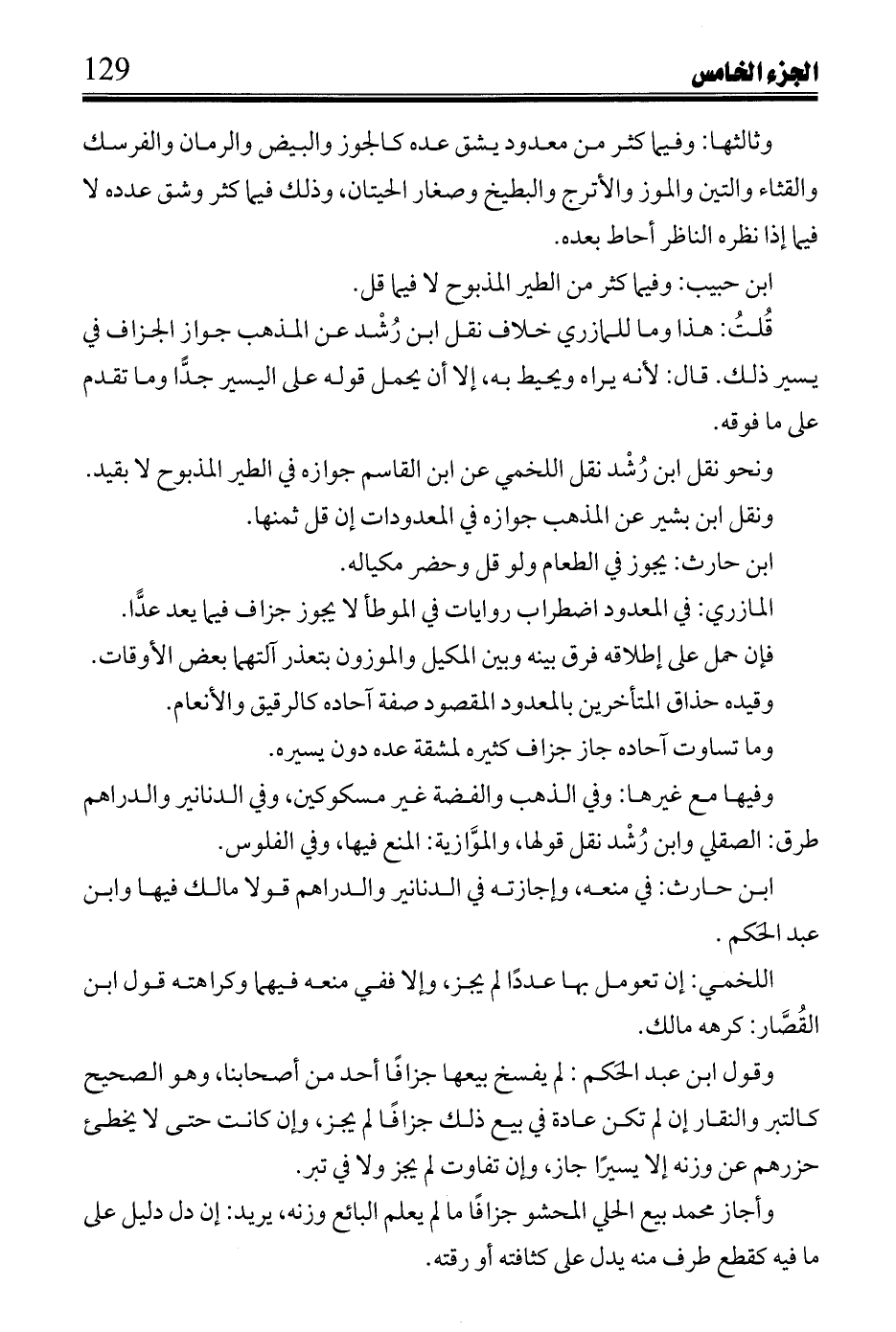 ابن رُشْد: لأن شراء ما وجده بحاله الغرر فيه غير مقصود وجزاف ما لم يجده بحالة جزافه الغرر فيه مقصود لتركه شراءه بمكيال معلوم، ولو قال: صبر من طعامك صبرة أشتريها منك جزافًا انبغى أن لا يجوز، لقصد الغرر. محمد عن ابن القاسم: لا بأس ببيع ما في البرج من حمام أو بيعه بحمامه جزافًا، وسمعه أصبغ: وقال: إذ عاينه وأحاط به نظرًا ومعرفة، رب كبير قليل العمارة، وصغير كبيرها.
