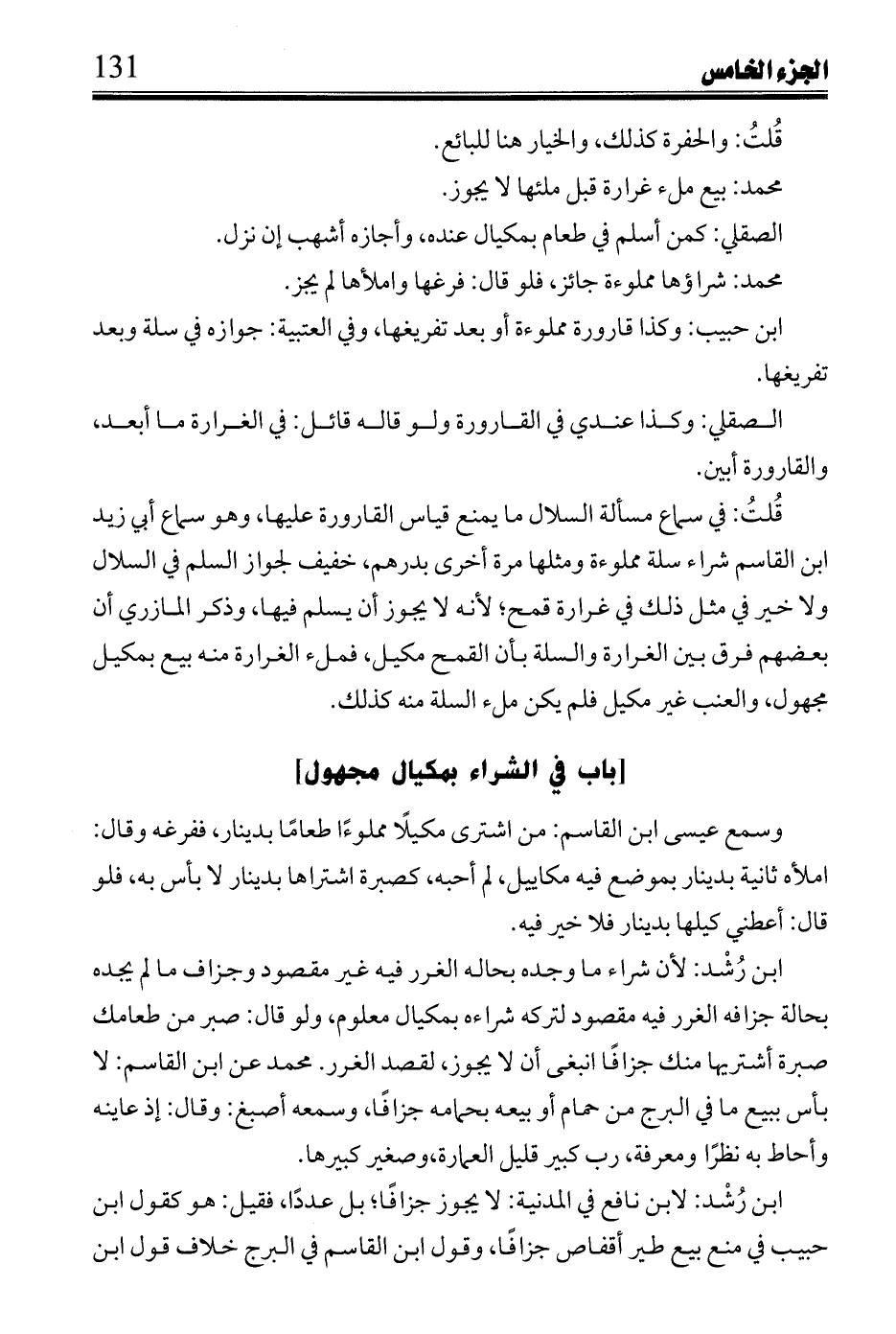 ابن رُشْد: بيع جزاف مع مكيل صفقة، منعه مالك وأصحابه اتفاقًا مجملًا، وتفصيله: