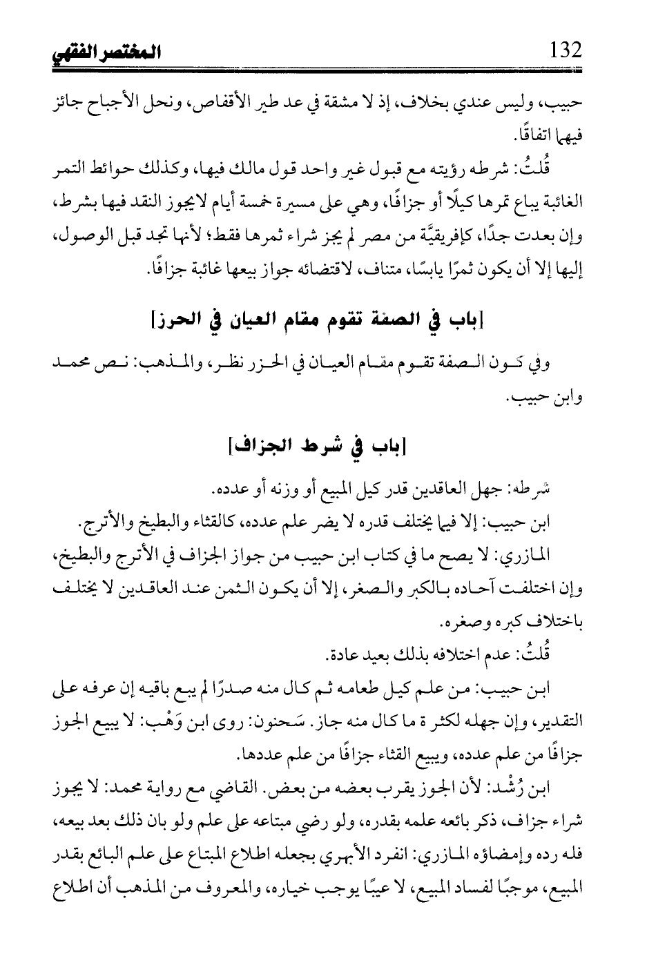 ابن القاسم: الجواز إن كان على غير الكيل، والمنع إن كان عليه، وهو المشهور. وبيع الجزافين على الكيل إن اتفق الكيل والطعام جاز، وإن اختلفا لم يجز اتفاقًا فيهما، وإلا كصبرتي طعام واحد، إحداهما ثلاثة بدينار، والأخرى أربعة به أو صبرتي قمح وشعير كل منهما ثلاثة بدينار، ففي جوازه قولا أَصْبَغ مع أشهب وابن القاسم، ولا يجوز عنده بيع مبذر عشرة أمداد كل قفيز بكذا، إن اختلفت الأرض وإن نظر إلى جميعها، ولا إن اتفقت مع ثمرة أو دار أو عرض، ويجوز على قول أشهب وأصبغ.