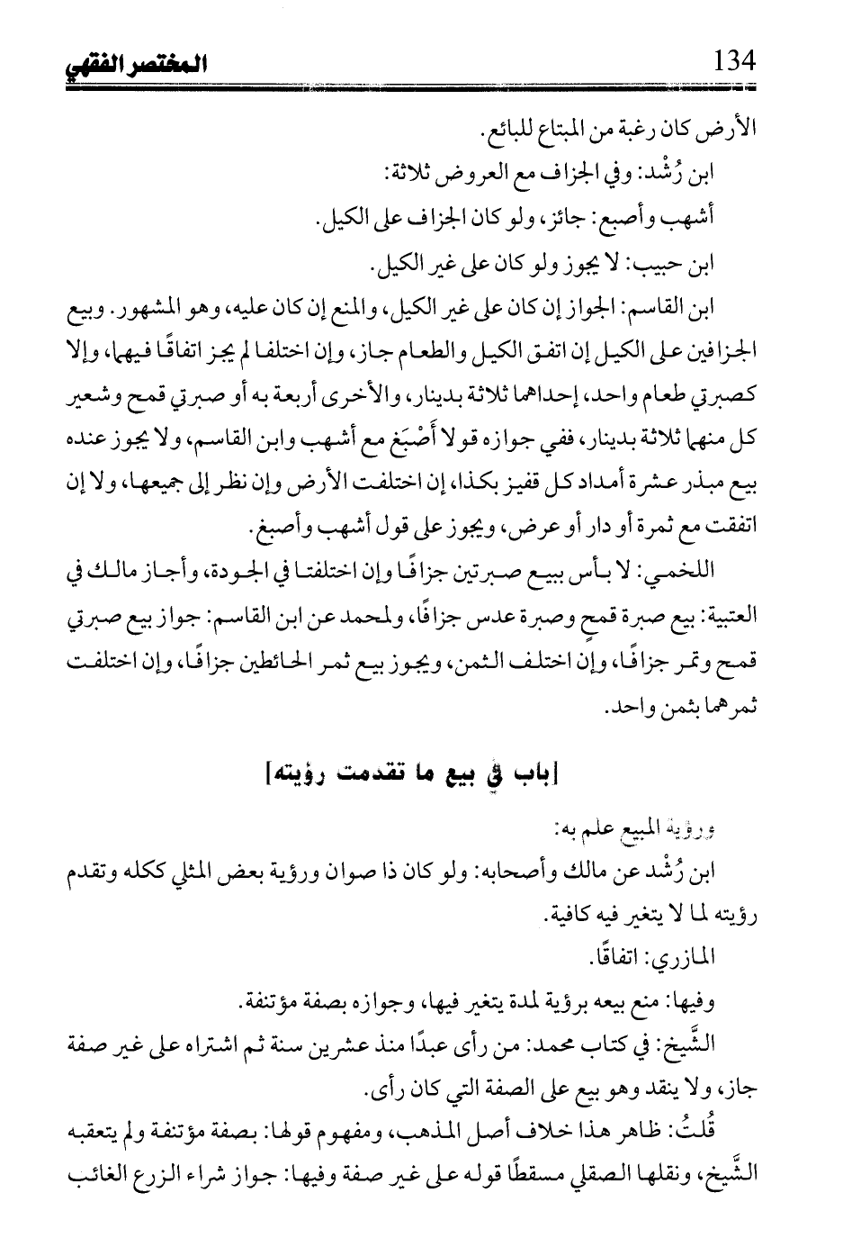 ابن رُشْد: أي لا بد في صفتها من ذكر ذرعها وذرع كل بيت طولًا وعرضًا، ولا يريد قصر جواز بيعها على كل ذراع بكذا؛ بل لا يجوز هذا إلا فيما تقدمت رؤيته كالأرض والصبرة.