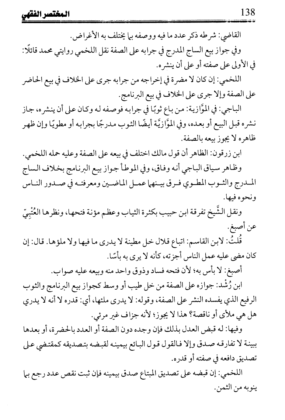 وفي كون تشبيهها بالطعام في رجوعه بقدر النقص منها من ثمنها دون تقويم؛ لأنها موصوفة إن قل نقصها، وإن كثر فله ردها لا في إن نقص ثلثها كثيرًا كالطعام أو فيهما قول ابن محرز، ونقله عن بعض المذاكرين.