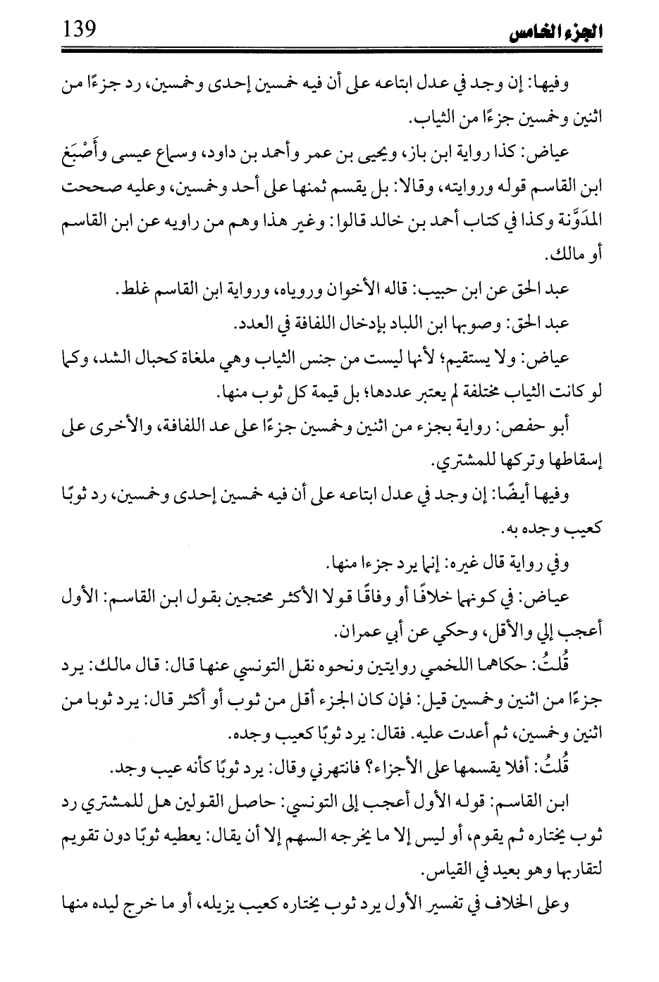 واغتفار يسير الخلاف فيه صواب لقولها في الخيار: إن اشترى خيارًا ثيابًا أو رقيقًا أو غنمًا على أنه بالخيار إذا نظرها فنظر أولها وصمت ثم لم يرض آخرها حين رآه فله رد ذلك، ولو كانت حنطه رضي بعضها ثم أنكر باقيها، فإن كانت على صفة ما رضي لزمه جميعها، وإن خالفه اختلافًا كثيرًا فله رد الجميع وليس لأحدهما إلزام البيع في المرضي فقط إلا برضى الآخر.