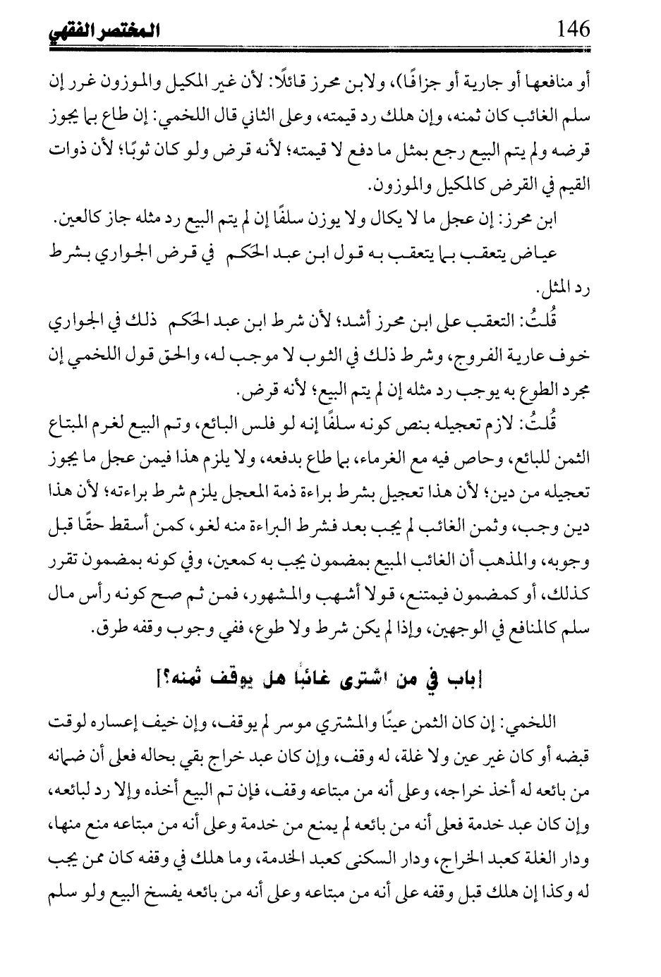 ابن رُشْد: قول ابن القاسم وسَحنون مفسر لقول مالك، أي: لا يجوز بيع الطعام الغائب جزافًا على الصفة. ولا يقوم من قوله: لا يجوز على شرط إن أدركته الصفقة جوازه دون شرط ذلك؛ بل لا يجوز في الحالين إذ لا يجوز أن يشتري على الصفة إلا ما يجوز السلم جوازه دون شرط ذلك فيه على الصفة، فكما لا يجوز السلم في الطعام على الصفة جزافًا فكذا لا يجوز بيعه غائبًا على الصفة جزافًا، وقوله: مثل الزرع القائم إذا يبس يحتمل أن يريد لا ينبغي كما لا ينبغي في الزرع القائم إذا يبس والأول أصح؛ لأن المعلوم من قول ابن القاسم وروايته في المدَوَّنة وغيرها، أنه لا يجوز السلم في فدادين من زرع على صفة، وإنما يصح الثاني على قول أشهب، يجوز السلم في قصيل على فدادين موصوفة وشراء الصبرة والزرع على رؤية متقدمة جائز اشترط الصفقة أو لا؟ قاله ابن حبيب وفرق في المدنيه من رواية ابن القاسم بمنع شراء الطعام على رؤية متقدمة، وأجازه في الزرع القائم، وهي تفرقة لاحظ للنظر فيها، وعزا التونسي قولها لابن الماجِشُون قائلًا: هذا المبيع على اشتراط الصفقة بيع براءة وقاطع عهدة الثلاث والستة،: وكأنه لما اشترط الضمان إن كانت موجودة حين العقد برئ من كل شيء.