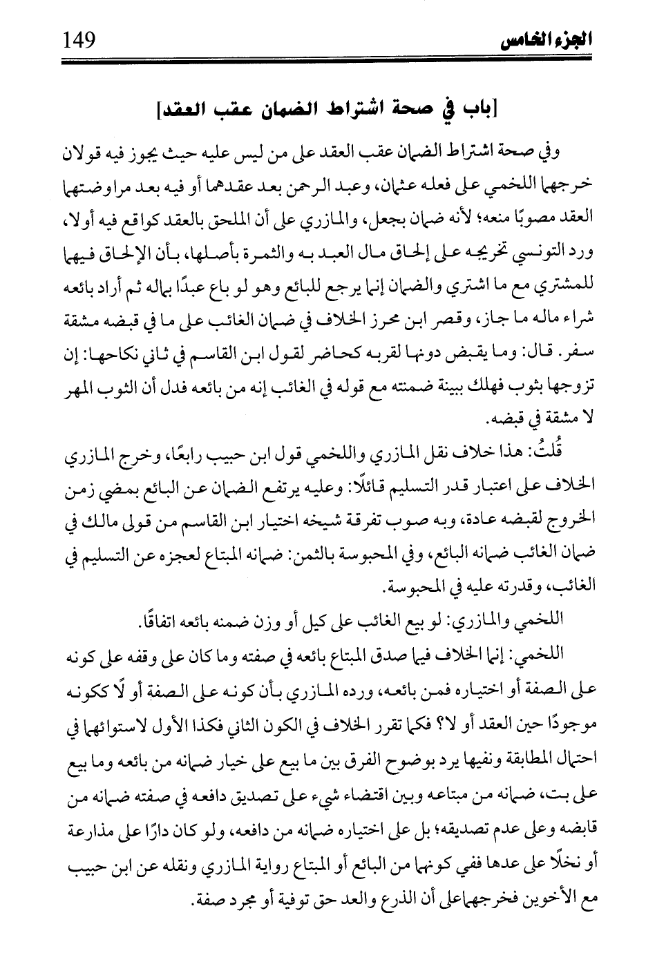 وفيها: احتيار ابن القاسم الضمان من البائع في الموت والنماء والنقصان، التونسي: ظاهره يحدث للبائع بالنماء خيار كخيار المشتري بالنقض، وعن سَحنون: إن ذلك في مال يحدث للعبد ولا فرق بينهما، والأشبه النقص اليسير، والنماء اليسير لا يوجبه؛ لأنهما دخلا عليهما، وما كان غير معتاد من نقص ونماء يوجبه.